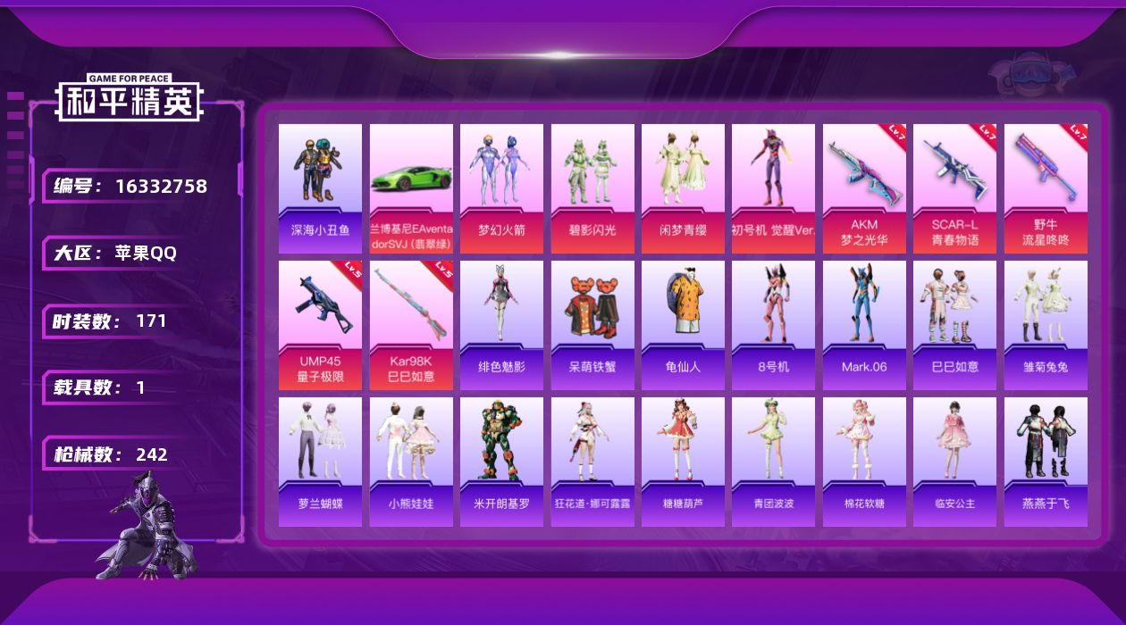 [16332758]【店主推荐捡漏号!可直接换绑】苹果 手Q-4粉装-5特效枪-1载具-0粉色飞行器-77137热力值-13王牌印记-171套装-242枪皮【热门品类】:粉装-梦幻火箭,套装-深海小丑鱼,套装-龟仙人,角色-8号机,角色-Mark.06【粉色套装】:粉装-梦幻火箭,粉装-碧影闪光,粉装-闲梦青缨,角色-初号机 觉醒Ver.【粉色枪皮等级】:AKM-梦之光华(七级),SCAR-L-青春物语(七级),UMP45-量子极限(五级),野牛-流星咚咚(七级),Kar98K-巳巳如意(五级)【粉色载具】:兰博基尼Aventador SVJ(翡翠绿)【粉色枪皮】:AKM-梦之光华,SCAR-L-青春物语,UMP45-量子极限,野牛-流星咚咚,Kar98K-巳巳如意