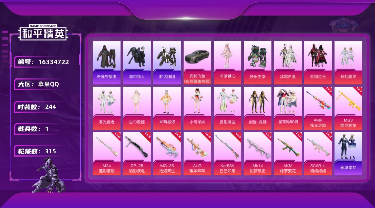 [16334722]【特价出售/店主推荐】地铁满天赋 苹果 手Q-无敌战神框-12粉装-10特效枪-1载具-7粉色飞行器-96842热力值-12王牌印记-244套装-315枪皮【热门品类】:套装-浪漫天命,套装-都市猎人,套装-小丑鱼,套装-奇异狩猎者,套装-胖达团团,角色-2B战斗服款,套装-龟仙人,套装-潮萌小黄鸭,套装-暗影哥特【粉色套装】:粉装-快乐主宰,粉装-冰霜白皇,粉装-炙焰红王,粉装-彩虹鹿灵,粉装-寒光使者,角色-白勺歌姬,角色-呆萌星弥,角色-小可学妹,粉装-莲影清波,套装-创世·救赎,粉装-星穹咏叹调,角色-羊梦糖心【粉色枪皮等级】:AKM-绿萝繁花(四级),SCAR-L-锦绣绵绵(四级),AUG-暖羊咩咩(五级),Kar98K-巳巳如意(五级),M24-莲影清波(六级),Mk14-甜梦熊击(五级),AMR-炫光之旅(七级),DP-28-豹影疾电(五级),MG3-酷泡奶龙(七级),MG-36-沧焰双生(五级)【粉色载具】:宾利飞驰(布罗德盖棕双色)【粉色枪皮】:AKM-绿萝繁花,SCAR-L-锦绣绵绵,AUG-暖羊咩咩,Kar98K-巳巳如意,M24-莲影清波,Mk14-甜梦熊击,AMR-炫光之旅,DP-28-豹影疾电,MG3-酷泡奶龙,MG-36-沧焰双生【粉色飞行器】:相思残雪飞行器,白勺歌姬飞行器,镜域双华-灵镜之阶,龙翔九天飞行器,圣域金龙飞行器,雀灵庇佑飞行器