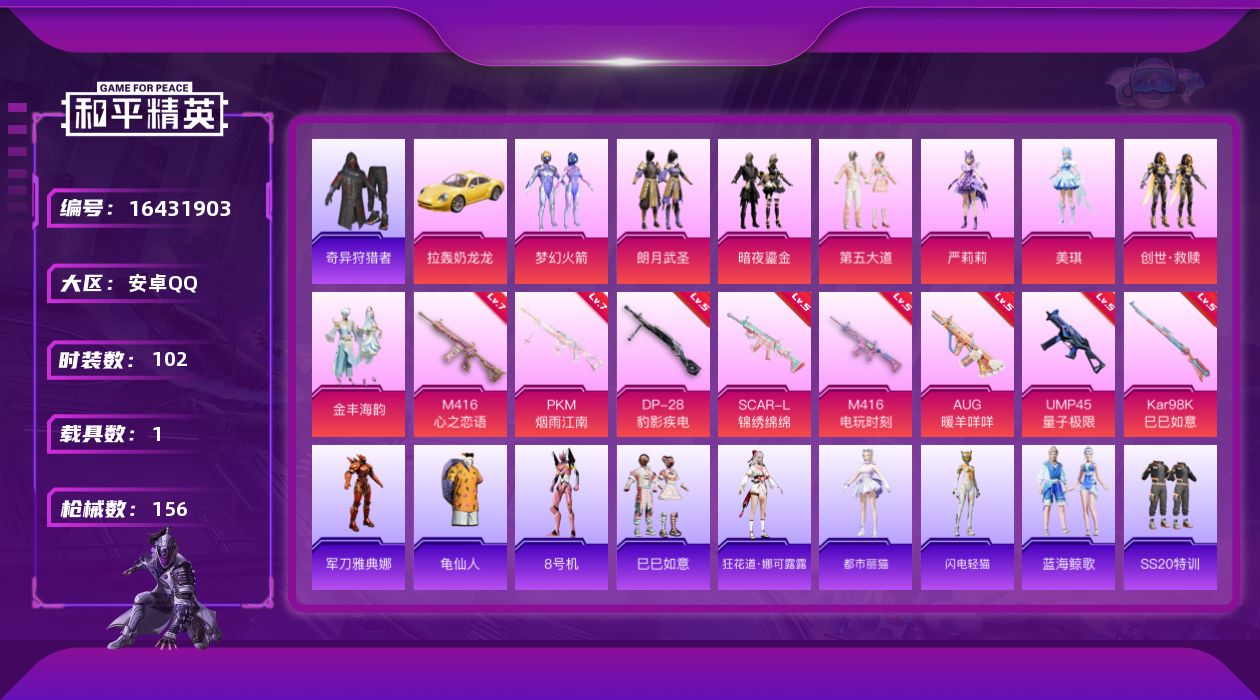 - [16906776]安卓 手Q-3粉装-4特效枪-0载具-1粉色飞行器-75575热力值-17王牌印记-179套装-228枪皮 【热门品类】:套装-龟仙人 【粉色套装】:粉装-俏皮狐尾,角色-羊梦糖心,角色-异瞳寒姬 【粉色枪皮等级】:AUG-暖羊咩咩(五级),Kar98K-巳巳如意(五级),Mk14-甜梦熊击(五级),DP-28-豹影疾电(五级) 【粉色枪皮】:AUG-暖羊咩咩,Kar98K-巳巳如意,Mk14-甜梦熊击,DP-28-豹影疾电 【粉色飞行器】:炫彩糖果飞行器 【粉色降落伞】:旋转彩虹降落伞,暗夜鎏金降落伞,精灵梦叶罗丽降落伞,鬼刀降落伞,樱桃泡泡降落伞,幻彩电音降落伞,异瞳寒姬降落伞,炫彩糖果降落伞,罪夜之冕降落伞 【稀有套装】:套装-龟仙人,套装-巳巳如意,套装-雪国风尚,套装-炫彩糖果,套装-燕燕于飞,套装-鱼渊荷华,角色-风玲,角色-海琴烟,套装-霓虹热舞,套装-彩虹兔,套装-云朵鹅,套装-雪绒豹,套装-朱霞炽焰,套装-凌霄紫焰,玩偶服-喜羊羊,角色-绯色魅影,套装-书海巡游,套装-画境星梦,套装-琴音绮想 【稀有枪皮】:AKM-夜灯,AKM-彩虹符号,AKM-灼热熔岩,AKM-破晓战魂,AKM-萌趣颜团子,AKM-虎虎生威,AKM-霓虹街区,AKM-龙的传人,M16A4-幻世战舞者,M16A4-红色方程式,M16A4-蓝色火焰,SCAR-L-夜灯,SCAR-L-玉兔迎春,SCAR-L-红色方程式,M416-夜灯,M416-神秘黑猫,M416-糯团青竹,M416-红色方程式,M416-蓝色火焰,GROZA-异彩先驱,GROZA-彩虹符号,GROZA-懵萌河马,GROZA-治愈之星,AUG-天降萌叽,AUG-耀粉歌者,AUG-绝对恒星,QBZ-彩虹符号,QBZ-飞驰魅影,M762-天降萌叽,M762-瑞龙福将,M762-云朵鹅,G36C-懵萌河马,G36C-时空追击者,G36C-暗夜玫瑰,G36C-星穹咏叹调,AC-VAL-天降萌叽,蜜獾-天降萌叽,蜜獾-娇憨猪猪,ACE32-画境星梦,ARX-凌霄紫焰,UZI-啾咪啾咪,UZI-天降萌叽,UZI-娇憨猪猪,UZI-炫彩节奏,UZI-红色方程式,UMP45-仲夏莫吉托,UMP45-时空追击者,UMP45-灵符少年,UMP45-生命誓言,UMP45-蓝色火焰,Vector-彩虹符号,Vector-治愈之星,Vect