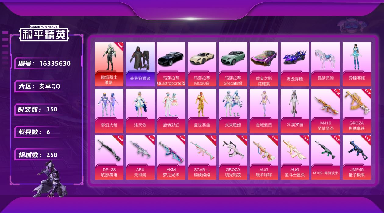 [16335630]满级m4至情至胜【特价出售/店主推荐】安卓 手Q-1神装-8粉装-17特效枪-6载具-1僚机-9粉色飞行器-93825热力值-13王牌印记-150套装-258枪皮【红色神装等级】:幽焰骑士-维塔(二级)【红色角色神装】:幽焰骑士-维塔【热门品类】:粉装-梦幻火箭,套装-浪漫天命,套装-小丑鱼,套装-奇异狩猎者,套装-龟仙人,角色-8号机,角色-Mark.06【粉色套装】:粉装-梦幻火箭,角色-洛天依,粉装-旋转彩虹,粉装-盖世英雄,粉装-未来歌姬,角色-金域紫灵,角色-冷漠罗丽,角色-异瞳寒姬【粉色枪皮等级】:AKM-梦之光华(五级),AKM-幽焰骑士(三级),SCAR-L-锦绣绵绵(五级),M416-至情至圣(九级),GROZA-焦糖拿铁(七级),GROZA-镜光银凌(五级),AUG-暖羊咩咩(五级),AUG-圣斗士星矢(五级),M762-青锋波束(五级),ARX-无垠阁(五级),UMP45-量子极限(五级),P90-粉樱探戈(五级),Kar98K-巳巳如意(五级),Mk14-甜梦熊击(五级),AMR-智耀战神(五级),M249-彩虹甜喵(四级),DP-28-豹影疾电(五级)【粉色载具】:玛莎拉蒂MC20(星石白),玛莎拉蒂Quattroporte(夜幕蓝),玛莎拉蒂Grecale(薄荷绿),虚妄之影(炫耀紫),海龙奔腾,僚机-萌兔起飞,晶梦灵驹【粉色枪皮】:AKM-梦之光华,AKM-幽焰骑士,SCAR-L-锦绣绵绵,M416-至情至圣,GROZA-焦糖拿铁,GROZA-镜光银凌,AUG-暖羊咩咩,AUG-圣斗士星矢,M762-青锋波束,ARX-无垠阁,UMP45-量子极限,P90-粉樱探戈,Kar98K-巳巳如意,Mk14-甜梦熊击,AMR-智耀战神,M249-彩虹甜喵,DP-28-豹影疾电【粉色飞行器】:梦幻火箭飞行器,翩跹演武飞行器,深渊漩涡飞行器,英伦信使飞行器,幽焰列车飞行器,凤舞九天飞行器,终晖之翼飞行器,极意拳锋飞行器