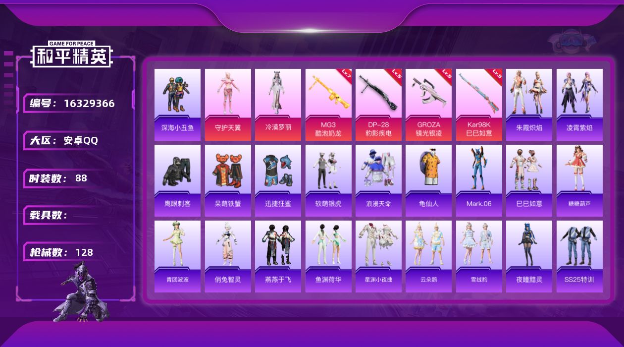 [16329366]【店主推荐捡漏号!可直接换绑】安卓 手Q-2粉装-4特效枪-0载具-1粉色飞行器-34598热力值-2王牌印记-88套装-128枪皮【热门品类】:套装-浪漫天命,套装-深海小丑鱼,套装-龟仙人,角色-Mark.06【粉色套装】:角色-守护天翼,角色-冷漠罗丽【粉色枪皮等级】:GROZA-镜光银凌(五级),Kar98K-巳巳如意(五级),DP-28-豹影疾电(五级),MG3-酷泡奶龙(七级)【粉色枪皮】:GROZA-镜光银凌,Kar98K-巳巳如意,DP-28-豹影疾电,MG3-酷泡奶龙