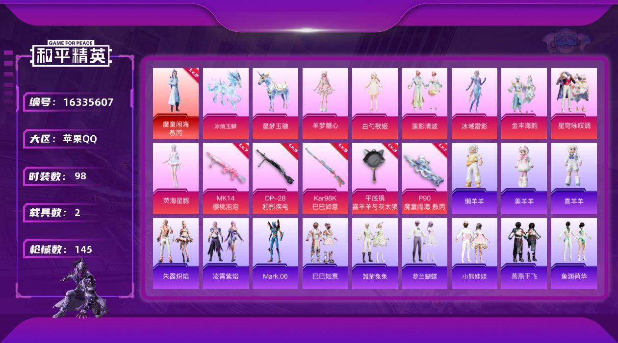 [16335607]【店主推荐捡漏号!可直接换绑】苹果 手Q-1神装-8粉装-5特效枪-2载具-4粉色飞行器-50752热力值-10王牌印记-98套装-145枪皮【红色神装等级】:魔童闹海-敖丙(二级)【红色角色神装】:魔童闹海-敖丙【热门品类】:角色-Mark.06【粉色套装】:角色-白勺歌姬,粉装-莲影清波,角色-冰域雷影,粉装-金丰海韵,粉装-星穹咏叹调,角色-荧海星豚,角色-羊梦糖心【粉色枪皮等级】:P90-魔童闹海 敖丙(一级),Kar98K-巳巳如意(五级),Mk14-樱桃泡泡(七级),DP-28-豹影疾电(五级),平底锅-喜羊羊与灰太狼(三级)【粉色载具】:星梦玉骢,冰绡玉鳞【粉色枪皮】:P90-魔童闹海 敖丙,Kar98K-巳巳如意,Mk14-樱桃泡泡,DP-28-豹影疾电,平底锅-喜羊羊与灰太狼【粉色飞行器】:龙翔九天飞行器,飞天猪飞行器,灵珠游龙飞行器