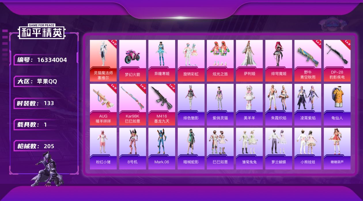[16334004]【店主推荐捡漏号!可直接换绑】苹果 手Q-1神装-5粉装-5特效枪-1载具-3粉色飞行器-65381热力值-9王牌印记-133套装-205枪皮【红色神装等级】:灵猫魔法师-塞维尔(二级)【红色角色神装】:灵猫魔法师-塞维尔【热门品类】:套装-龟仙人,套装-粉红小猪,角色-8号机,角色-Mark.06【粉色套装】:粉装-旋转彩虹,粉装-炫光之旅,角色-萨利娅,角色-绯穹魔姬,角色-异瞳寒姬【粉色枪皮等级】:M416-墨龙九天(三级),AUG-暖羊咩咩(五级),野牛-青空秋雨(七级),Kar98K-巳巳如意(五级),DP-28-豹影疾电(五级)【粉色载具】:双人摩托-梦幻火箭【粉色枪皮】:M416-墨龙九天,AUG-暖羊咩咩,野牛-青空秋雨,Kar98K-巳巳如意,DP-28-豹影疾电【粉色飞行器】:梦幻火箭飞行器,镜域双华-灵镜之阶,飞天猪飞行器