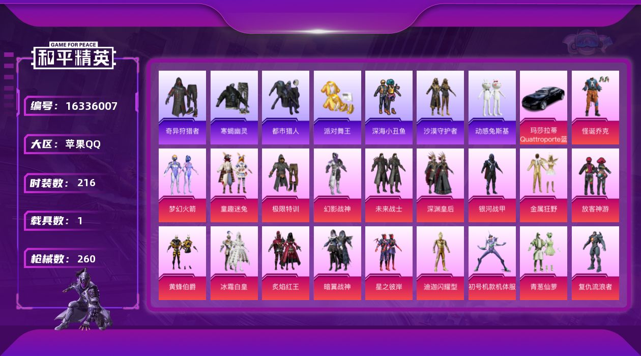 - [15142841]【店主推荐捡漏号!可直接换绑】素材身法号 苹果 手Q-3神装-20粉装-15特效枪-3载具-15粉色飞行器-7.7w热力值-4王牌印记-145套装-188枪皮【红色神装等级】:金蛇镇世-烛九(一级),幽焰骑士-维塔(一级),镜域双华-欧若拉(一级)【热门品类】:套装-深海小丑鱼,套装-龟仙人,套装-糯粉咩咩,角色-Mark.06,套装-红熊茄茄【粉色载具】:双人摩托-梦幻火箭,星梦玉骢,晶梦灵驹【粉色套装】:粉装-宝贝奶油派,粉装-蝶舞迷情,粉装-甜蜜誓约,粉装-旋转彩虹,粉装-第五大道,角色-白勺歌姬,角色-呆萌星弥,角色-小可学妹,粉装-未来歌姬,角色-严莉莉,角色-小蓝,角色-美雪,角色-光极星,角色-星梦奇缘,角色-守护天翼,角色-千金淑猫,角色-月影灵韵,角色-女娲灵识,角色-晶梦幻蝶,角色-樱桃泡泡【粉色枪皮等级】:AKM-幽焰骑士(三级),M16A4-晶梦幻蝶(二级),M416-墨龙九天(三级),UZI-绮梦青鸾(四级),UMP45-相思残雪(四级),Kar98K-巳巳如意(五级),AWM-橘柚倾心(六级),Mk14-盛世惊鸿(三级),SLR-暗夜玫瑰(五级),AMR-炫光之旅(一级),AMR-鸢尾晶梦(五级),M249-彩虹甜喵(七级),DP-28-千金淑猫(四级),烟雾弹-丁香清露(三级),破片手榴弹-热量炸弹(四级)【粉色飞行器】:酣梦熊熊飞行器,春暖花开飞行器,梦幻火箭飞行器,心之恋语飞行翼,沙丘之主天马,镜域双华-灵镜之阶,龙翔九天飞行器,幻海精灵飞行器,深渊漩涡飞行器,曦华影飞行器,幽焰列车飞行器,凤舞九天飞行器,万象金身飞行器