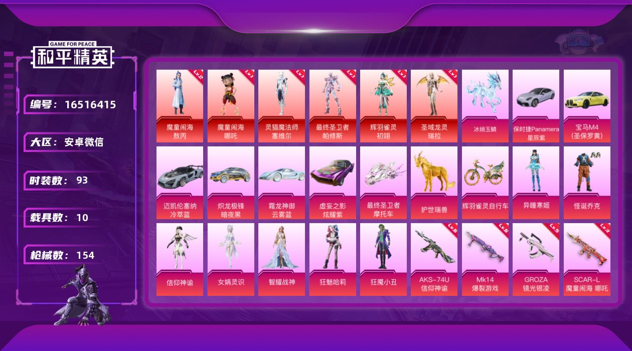 [16516415]【特价出售/店主推荐】安卓 微信-6神装-7粉装-13特效枪-10载具-13粉色飞行器-68537热力值-9王牌印记-93套装-154枪皮 【红色神装等级】:魔童闹海-敖丙(二级),魔童闹海-哪吒(一级),灵猫魔法师-塞维尔(一级),最终圣卫者-帕修斯(一级),辉羽雀灵-初翊(一级),圣域龙灵-瑞拉(一级) 【红色角色神装】:魔童闹海-敖丙,魔童闹海-哪吒,灵猫魔法师-塞维尔,最终圣卫者-帕修斯,辉羽雀灵-初翊,圣域龙灵-瑞拉 【热门品类】:粉装-怪诞乔克 【粉色套装】:粉装-怪诞乔克,角色-信仰神谕,角色-女娲灵识,角色-智耀战神,角色-狂魅哈莉,角色-狂魇小丑,角色-异瞳寒姬 【粉色枪皮等级】:AKM-幽焰骑士(三级),SCAR-L-魔童闹海 哪吒(三级),M416-女娲灵识(一级),M416-灵猫魔法师(三级),GROZA-镜光银凌(五级),Vector-最终圣卫者(三级),AKS-74U-信仰神谕(六级),P90-魔童闹海 敖丙(三级),Kar98K-巳巳如意(一级),Kar98K-圣域龙灵(一级),Mk14-爆裂游戏(六级),DP-28-豹影疾电(一级),MG3-辉羽雀灵(三级) 【粉色载具】:宝马M4(圣保罗黄),迈凯伦塞纳(冷萃蓝),炽龙极锋(暗夜黑),霜龙神御(云雾蓝),保时捷Panamera(星辰紫),虚妄之影(炫耀紫),最终圣卫者摩托车,护世瑞兽,冰绡玉鳞,辉羽雀灵自行车 【粉色枪皮】:AKM-幽焰骑士,SCAR-L-魔童闹海 哪吒,M416-女娲灵识,M416-灵猫魔法师,GROZA-镜光银凌,Vector-最终圣卫者,AKS-74U-信仰神谕,P90-魔童闹海 敖丙,Kar98K-巳巳如意,Kar98K-圣域龙灵,Mk14-爆裂游戏,DP-28-豹影疾电,MG3-辉羽雀灵 【粉色飞行器】:酣梦熊熊飞行器,镜域双华-灵镜之阶,英伦信使飞行器,幽焰列车飞行器,信仰神谕飞行器,万象金身飞行器,圣域金龙飞行器,雀灵庇佑飞行器,终晖之翼飞行器,灵猫魔法师飞行器,飞天猪飞行器,灵珠游龙飞行器 【粉色降落伞】:环太平洋降落伞,幽焰骑士降落伞,临安公主降落伞,信仰神谕降落伞,圣域龙灵降落伞,智耀战神降落伞,幻海仙踪降落伞,辉羽雀灵降落伞,时光之誓降落伞,双重狂想降落伞,最终圣卫者降落伞,灵猫魔法师降落伞,魔童闹海 哪吒降落伞,魔童闹海 敖丙降落伞,异瞳寒姬