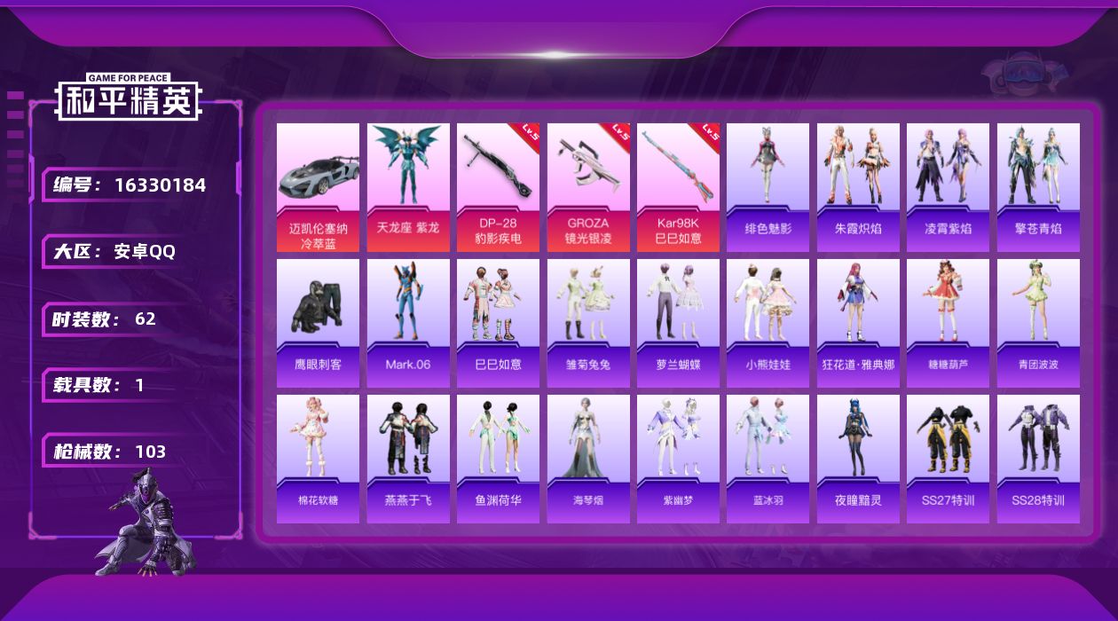 [16330184]【特价出售/店主推荐】 地铁满天赋 安卓 手Q-1粉装-3特效枪-1载具-1粉色飞行器-3w热力值-6王牌印记-62套装-103枪皮【热门品类】:角色-Mark.06【粉色套装】:角色-天龙座 紫龙【粉色枪皮等级】:GROZA-镜光银凌(五级),Kar98K-巳巳如意(五级),DP-28-豹影疾电(五级)【粉色载具】:迈凯伦塞纳(冷萃蓝)【粉色枪皮】:GROZA-镜光银凌,Kar98K-巳巳如意,DP-28-豹影疾电