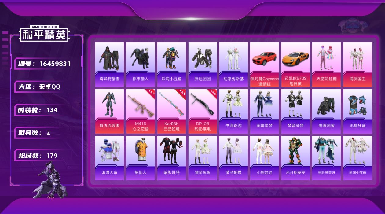 [16459831]【特价出售/店主推荐】安卓 手Q-3粉装-3特效枪-2载具-0粉色飞行器-52818热力值-11王牌印记-134套装-179枪皮 【热门品类】:套装-浪漫天命,套装-都市猎人,套装-深海小丑鱼,套装-奇异狩猎者,套装-胖达团团,套装-动感兔斯基人偶服,套装-龟仙人,套装-暗影哥特 【粉色套装】:粉装-天使彩虹糖,粉装-海渊国主,角色-复仇流浪者 【粉色枪皮等级】:M416-心之恋语(七级),Kar98K-巳巳如意(五级),DP-28-豹影疾电(三级) 【粉色载具】:迈凯伦570S(旭日黄),保时捷Cayenne(激情红) 【粉色枪皮】:M416-心之恋语,Kar98K-巳巳如意,DP-28-豹影疾电 【粉色降落伞】:未来战士降落伞,碧影闪光降落伞,翩跹演武降落伞,暗夜鎏金降落伞,沙丘之主降落伞,星穹咏叹调降落伞,幻彩电音降落伞,异瞳寒姬降落伞 【稀有套装】:套装-龟仙人,套装-雪国风尚,套装-雏菊兔兔,套装-萝兰蝴蝶,套装-小熊娃娃,角色-米开朗基罗,套装-星影赞美诗,套装-星渊小夜曲,套装-书海巡游,套装-画境星梦,套装-琴音绮想 【稀有枪皮】:AKM-奇异狩猎者,AKM-影袭,AKM-灼热熔岩,AKM-环太平洋,AKM-缤纷海域,AKM-霓虹街区,AKM-龙的传人,M16A4-幻世战舞者,M16A4-甜心亚梦,SCAR-L-炫彩节奏,SCAR-L-玉兔迎春,SCAR-L-红色方程式,M416-糯团青竹,M416-红色方程式,M416-蓝色火焰,GROZA-影袭,GROZA-懵萌河马,GROZA-田园牧歌,AUG-天降萌叽,AUG-幻影战神,AUG-耀粉歌者,QBZ-飞驰魅影,M762-天降萌叽,M762-奇异狩猎者,M762-暗夜鎏金,Mk47-妙红点点,G36C-懵萌河马,G36C-炙焰牛王,G36C-星穹咏叹调,AC-VAL-天降萌叽,AC-VAL-快闪甜心,AC-VAL-甜心亚梦,蜜獾-垂柳戏鸭,蜜獾-天降萌叽,蜜獾-娇憨猪猪,ACE32-画境星梦,UZI-啾咪啾咪,UZI-天降萌叽,UZI-娇憨猪猪,UZI-幻影战神,UZI-影袭,UZI-炫彩节奏,UZI-红色方程式,UMP45-涂山之恋,UMP45-生命誓言,UMP45-蓝色火焰,UMP45-绒宝小鹅,UMP45-极意拳锋,Vector-焰鹰斗篷,Vector-生命誓言,Vector-田园牧歌,Ve