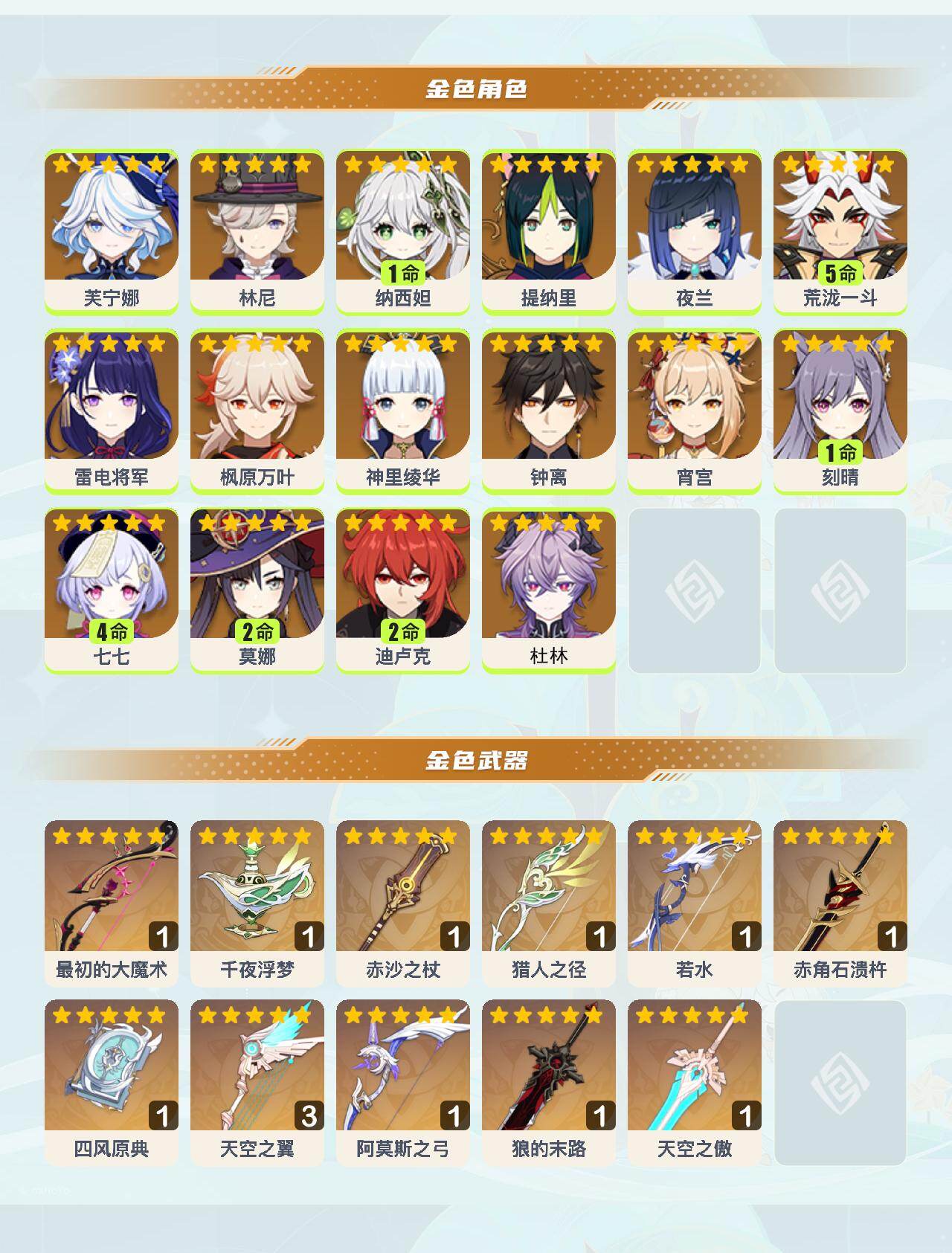 0命芙宁娜,0命林尼,1命纳西妲,0命提纳里,0命夜兰,5命荒泷一斗,0命雷电将军,0命枫原万叶,0命神里绫华,0命钟离,0命宵宫,1命刻晴,4命七七,2命莫娜,2命迪卢克,0命杜林,精1最初的大魔术,精1千夜浮梦,精1赤沙之杖,精1猎人之径,精1若水,精1赤角石溃杵,精1四风原典,精3天空之翼,精1阿莫斯之弓,精1狼的末路,精1天空之傲