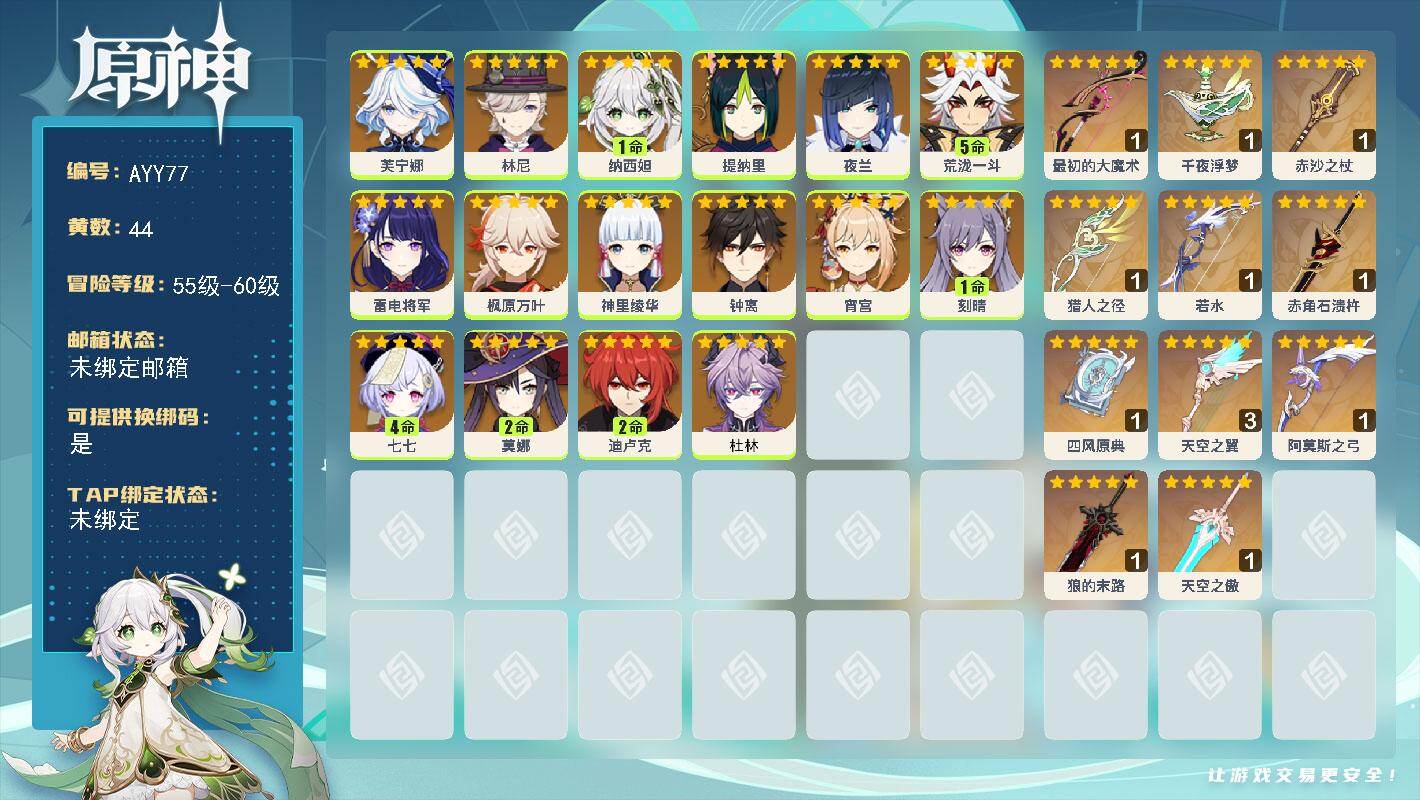 [16665637]58级/44黄/女主/16个五星角色/11个五星武器 0命芙宁娜,0命林尼,1命纳西妲,0命提纳里,0命夜兰,5命荒泷一斗,0命雷电将军,0命枫原万叶,0命神里绫华,0命钟离,0命宵宫,1命刻晴,4命七七,2命莫娜,2命迪卢克,0命杜林,精1最初的大魔术,精1千夜浮梦,精1赤沙之杖,精1猎人之径,精1若水,精1赤角石溃杵,精1四风原典,精3天空之翼,精1阿莫斯之弓,精1狼的末路,精1天空之傲