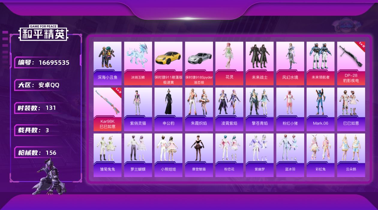 [16695535]【特价出售/店主推荐】安卓 手Q-无敌战神框-4粉装-2特效枪-3载具-2粉色飞行器-47427热力值-10王牌印记-131套装-156枪皮 【热门品类】:套装-深海小丑鱼,套装-粉红小猪,角色-Mark.06 【粉色套装】:粉装-未来战士,角色-风幻水境,粉装-未来领航者,角色-花灵 【粉色枪皮等级】:Kar98K-巳巳如意(五级),DP-28-豹影疾电(五级) 【粉色载具】:保时捷911 敞篷版(极速黄),保时捷918 Spyder(液态银),冰绡玉鳞 【粉色枪皮】:Kar98K-巳巳如意,DP-28-豹影疾电 【粉色飞行器】:灵珠游龙飞行器 【粉色降落伞】:炙焰牛王降落伞,第五大道降落伞,守护天翼降落伞,千金淑猫降落伞,鬼刀降落伞,冷漠罗丽降落伞,魔童闹海 敖丙降落伞,异瞳寒姬降落伞,炫彩糖果降落伞 【稀有套装】:套装-巳巳如意,套装-雪国风尚,套装-炫彩糖果,套装-雏菊兔兔,套装-萝兰蝴蝶,套装-小熊娃娃,角色-摩登魅猫,套装-粉恋花,套装-紫幽梦,套装-蓝冰羽,套装-彩虹兔,套装-云朵鹅,套装-雪绒豹,角色-灵公主,角色-乐音,套装-朱霞炽焰,套装-凌霄紫焰,套装-擎苍青焰,角色-申公豹,角色-紫俏灵猫 【稀有枪皮】:AUG-冰晶雪宝,AKM-影袭,M16A4-甜心亚梦,M16A4-莲影清波,M16A4-千金淑猫,SCAR-L-夜灯,SCAR-L-未来战士,SCAR-L-玉兔迎春,SCAR-L-粉锦千层,SCAR-L-冷漠罗丽,M416-糯团青竹,M416-蓝色火焰,AUG-幻影战神,AUG-耀粉歌者,M762-云朵鹅,AC-VAL-天降萌叽,AC-VAL-彩虹甜喵,AC-VAL-甜心亚梦,蜜獾-天降萌叽,蜜獾-娇憨猪猪,ARX-凌霄紫焰,UZI-啾咪啾咪,UZI-娇憨猪猪,UZI-红色方程式,UMP45-蓝色火焰,Vector-彩虹符号,Vector-生命誓言,汤姆逊-幻影战神,汤姆逊-耀粉歌者,野牛-最终圣卫者,JS9-凌霄紫焰,P90-巳巳如意,Kar98K-王子的夏天,M24-影袭,AWM-圣堂之誓,VSS-彩虹符号,Mini14-耀粉歌者,SLR-娇憨猪猪,M417-惊鸿侠骨,M200-惊鸿侠骨,SVD-云朵鹅,SVD-冷漠罗丽,S1897-炫彩节奏,S12K-娇憨猪猪,S12K-幻世战舞者,S12K-幻影战神,DBS-彩虹符号,DBS-甜心亚