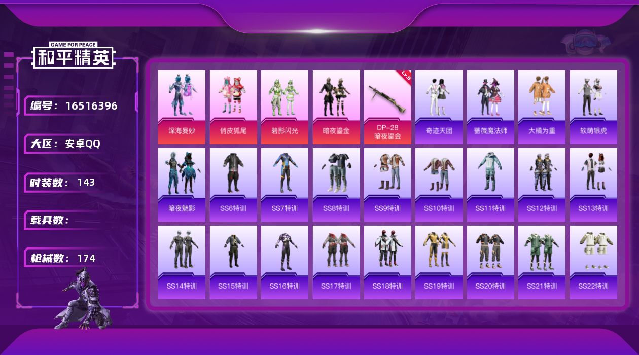 [16516396]【特价出售/店主推荐】安卓 手Q-4粉装-1特效枪-0载具-1粉色飞行器-55393热力值-2王牌印记-143套装-174枪皮【粉色套装】:粉装-深海曼妙,粉装-俏皮狐尾,粉装-碧影闪光,粉装-暗夜鎏金【粉色枪皮等级】:DP-28-暗夜鎏金(五级)【粉色枪皮】:DP-28-暗夜鎏金【粉色飞行器】:马卡龙飞行器