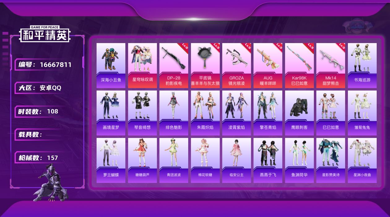 [16667811]【特价出售/店主推荐】安卓 手Q-1粉装-7特效枪-0载具-1粉色飞行器-41624热力值-6王牌印记-108套装-157枪皮