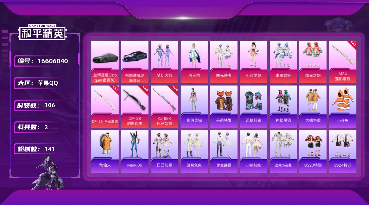 [16606040]【店主推荐捡漏号!可直接换绑】苹果 手Q-6粉装-4特效枪-2载具-3粉色飞行器-47413热力值-3王牌印记-106套装-141枪皮【热门品类】:粉装-梦幻火箭,套装-小丑鱼,套装-龟仙人,角色-Mark.06【粉色套装】:粉装-梦幻火箭,角色-洛天依,粉装-寒光使者,角色-小可学妹,粉装-未来歌姬,粉装-炫光之旅【粉色枪皮等级】:Kar98K-巳巳如意(五级),M24-莲影清波(七级),DP-28-千金淑猫(七级),DP-28-豹影疾电(五级)【粉色载具】:兰博基尼Estoque(银翼灰),布加迪威龙(海洋蓝)【粉色枪皮】:Kar98K-巳巳如意,M24-莲影清波,DP-28-千金淑猫,DP-28-豹影疾电【粉色飞行器】:天之羽翼飞行器,圣光天使飞行器,深渊漩涡飞行器
