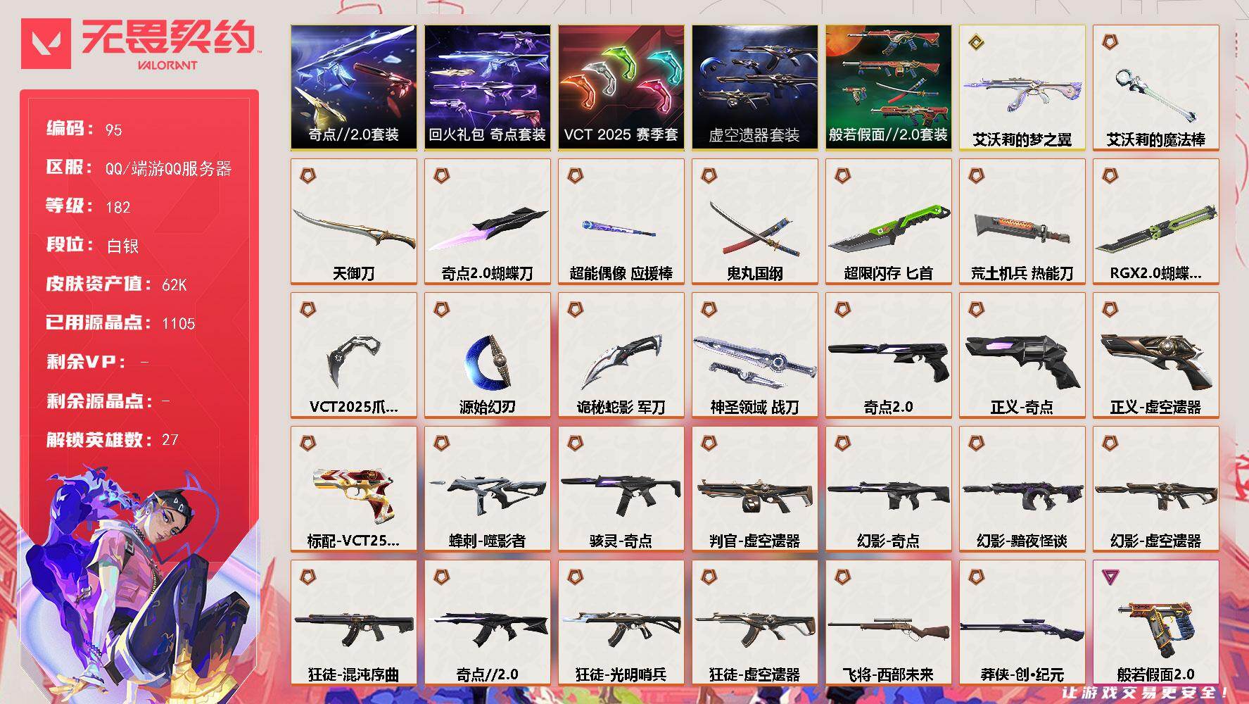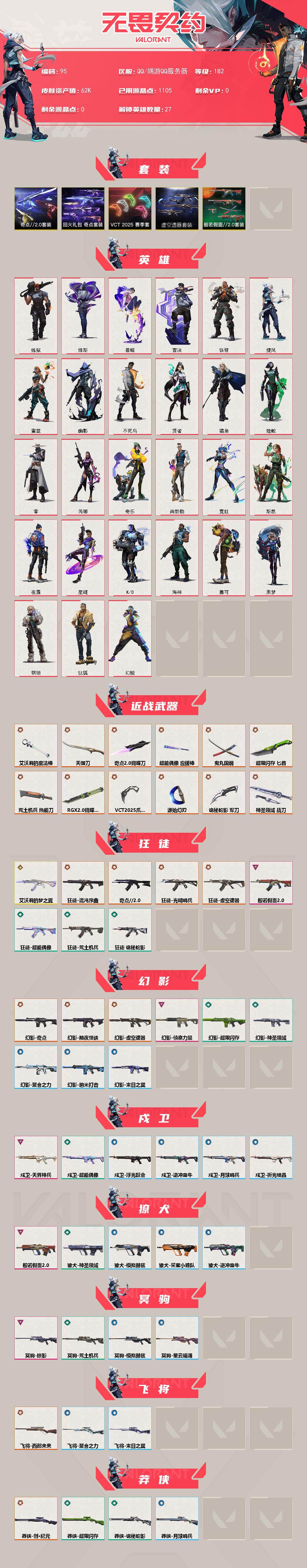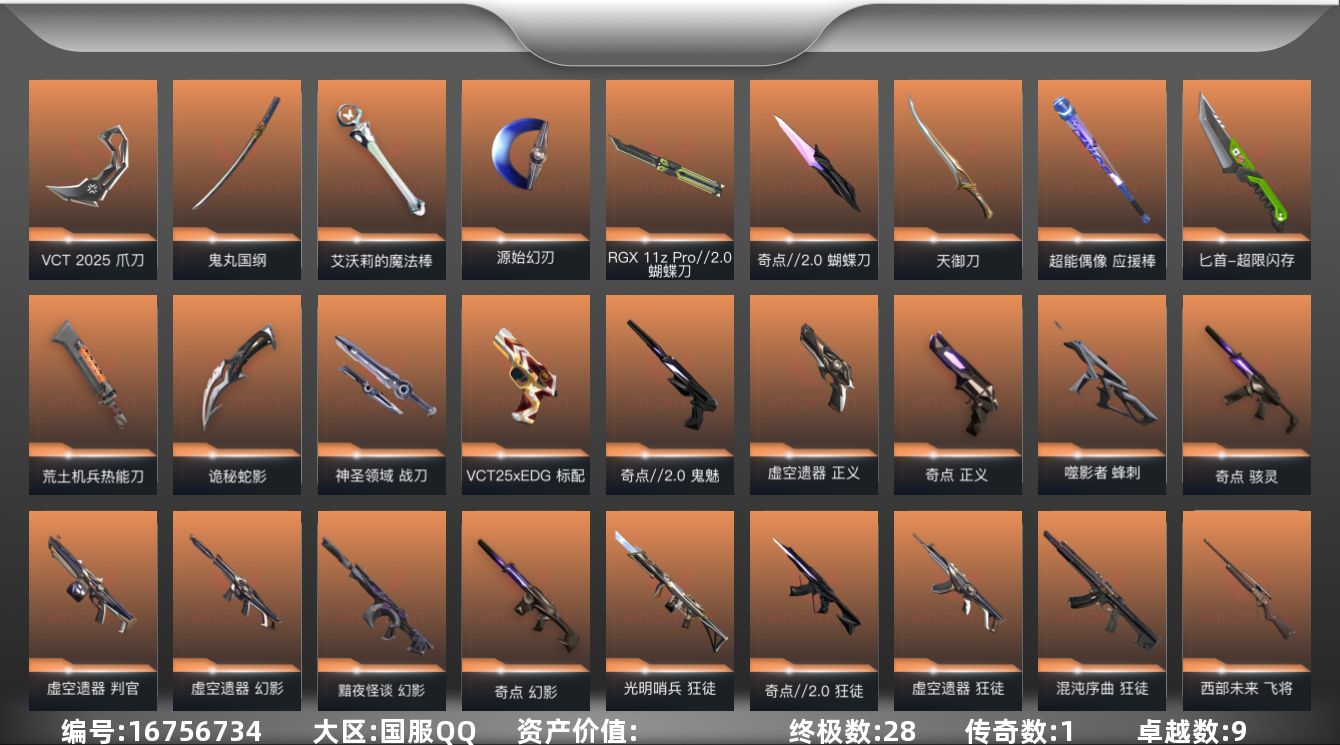 [16756734]【95】【套装】:虚空遗器套装,VCT 2025 赛季套装,奇点//2.0套装,回火礼包:奇点套装,般若假面//2.0套装 【英雄】:幻棱,炼狱,维斯,暮蝶,钛狐,壹决,铁臂,捷风,雷兹,幽影,不死鸟,贤者,猎枭,蝰蛇,零,芮娜,奇乐,尚勃勒,霓虹,斯凯,夜露,星礈,K/O,海神,盖可,黑梦,钢锁 【近战武器】:近战武器-RGX 11z Pro//2.0 蝴蝶刀,近战武器-奇点//2.0 蝴蝶刀,近战武器-VCT 2025 爪刀,近战武器-艾沃莉的魔法棒,近战武器-鬼丸国纲,近战武器-源始幻刃,近战武器-超能偶像 应援棒,近战武器-超限闪存 匕首,近战武器-荒土机兵 热能刀,近战武器-天御刀,近战武器-诡秘蛇影 军刀,近战武器-神圣领域 战刀 【狂徒】:狂徒-艾沃莉的梦之翼,狂徒-光明哨兵,狂徒-混沌序曲,狂徒-奇点//2.0,狂徒-虚空遗器,狂徒-般若假面//2.0,狂徒-超能偶像,狂徒-荒土机兵,狂徒-诡秘蛇影 【幻影】:幻影-黯夜怪谈,幻影-奇点,幻影-虚空遗器,幻影-侦察力量,幻影-超限闪存,幻影-神圣领域,幻影-聚合之力,幻影-纳米打击,幻影-末日之翼 【戍卫】:戍卫-天界神兵,戍卫-超能偶像,戍卫-浮光跃金,戍卫-逆冲蛮牛,戍卫-月球哨兵,戍卫-折光棱晶 【獠犬】:獠犬-般若假面//2.0,獠犬-神圣领域,獠犬-采蜜小蜂队,獠犬-模拟赫兹,獠犬-逆冲蛮牛 【冥驹】:冥驹-掠影,冥驹-荒土机兵,冥驹-模拟赫兹,冥驹-星云暗涌 【飞将】:飞将-西部未来,飞将-聚合之力,飞将-末日之翼 【莽侠】:莽侠-创·纪元,莽侠-超限闪存,莽侠-诡秘蛇影,莽侠-月球哨兵 【战神】:战神-般若假面//2.0,战神-神圣领域,战神-采蜜小蜂队,战神-浮光跃金 【奥丁】:奥丁-紫阙金琅//2.0,奥丁-纳米打击,奥丁-末日之翼 【判官】:判官-虚空遗器,判官-超能偶像,判官-诡秘蛇影,判官-采蜜小蜂队,判官-纳米打击x 【雄鹿】:雄鹿-模拟赫兹,雄鹿-逆冲蛮牛,雄鹿-月球哨兵 【骇灵】:骇灵-奇点,骇灵-荒土机兵,骇灵-浮光跃金,骇灵-星云暗涌 【蜂刺】:蜂刺-噬影者,蜂刺-超限闪存,蜂刺-聚合之力,蜂刺-星云暗涌,蜂刺-折光棱晶 【标配】:标配-超能偶像,标配-荒土机兵,标配-浮光跃金,标配-折光棱晶 【VCT手枪】:标配-VCT25 x EDG 【正义】:正义-奇点,正义