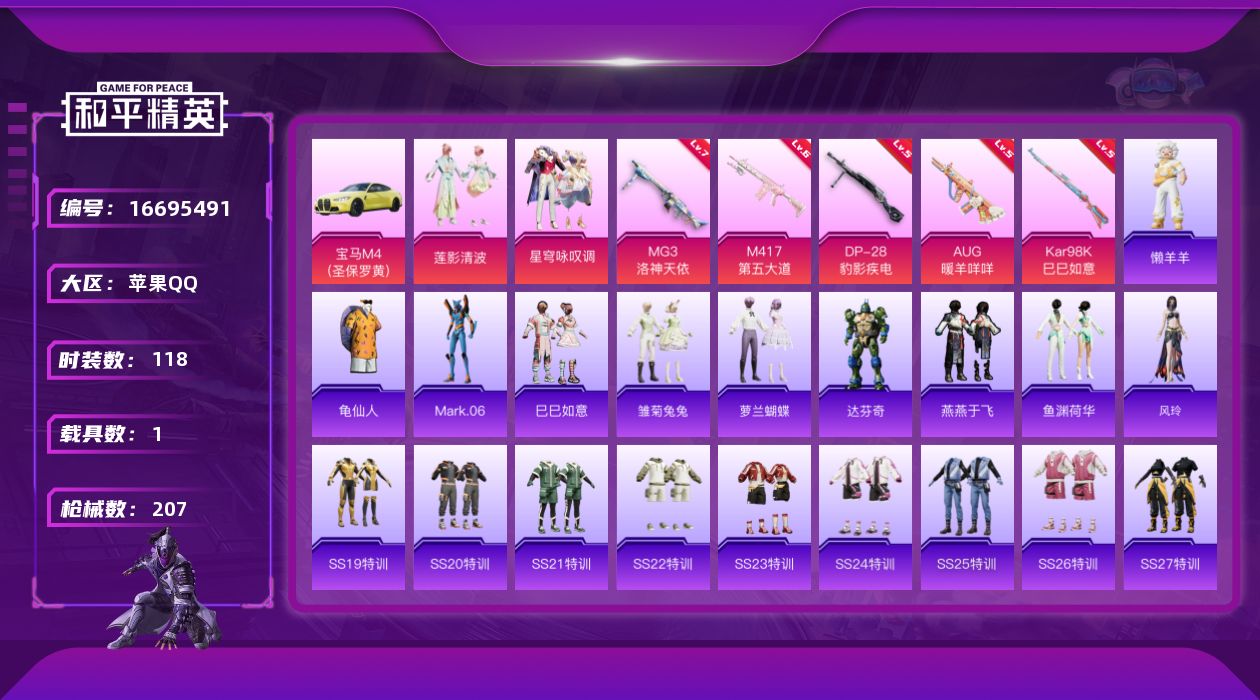 [16695491]【特价出售/店主推荐】苹果 手Q-2粉装-5特效枪-1载具-3粉色飞行器-53529热力值-16王牌印记-118套装-207枪皮【热门品类】:套装-龟仙人,角色-Mark.06【粉色套装】:粉装-莲影清波,粉装-星穹咏叹调【粉色枪皮等级】:AUG-暖羊咩咩(五级),Kar98K-巳巳如意(五级),M417-第五大道(六级),DP-28-豹影疾电(五级),MG3-洛神天依(七级)【粉色载具】:宝马M4(圣保罗黄)【粉色枪皮】:AUG-暖羊咩咩,Kar98K-巳巳如意,M417-第五大道,DP-28-豹影疾电,MG3-洛神天依 -牛气冲天,套装-牛气满满,套装-玉兔迎春,套装-王牌教练,套装-甜蜜告白,套装-白色伏地魔,套装-破晓战魂,套装-破蛋小黄鸡,套装-空岛之星,套装-竞