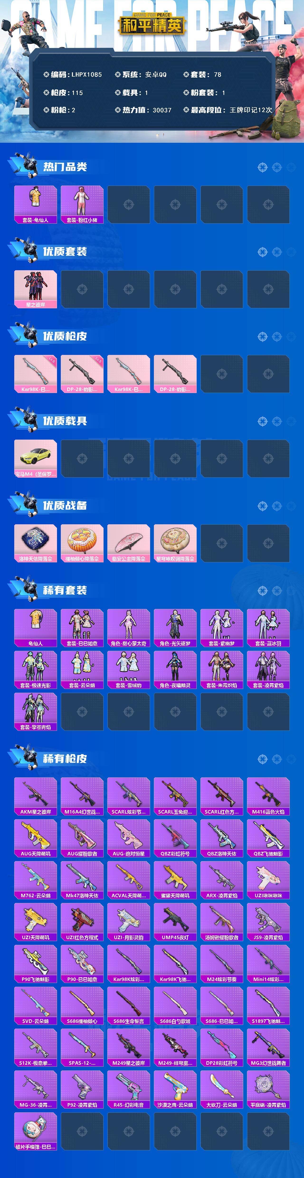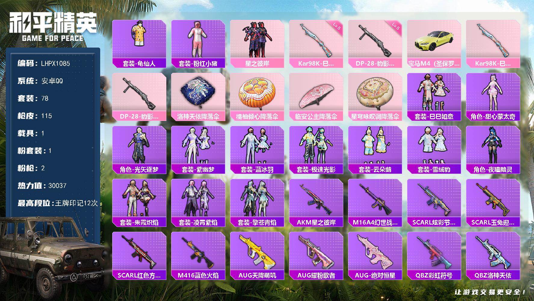 [16735356]【店主推荐捡漏号!可直接换绑】安卓 手Q-1粉装-2特效枪-1载具-1粉色飞行器-30037热力值-12王牌印记-78套装-115枪皮【热门品类】:套装-龟仙人,套装-粉红小猪【粉色套装】:粉装-星之彼岸【粉色枪皮等级】:Kar98K-巳巳如意(五级),DP-28-豹影疾电(五级)【粉色载具】:宝马M4(圣保罗黄)【粉色枪皮】:Kar98K-巳巳如意,DP-28-豹影疾电