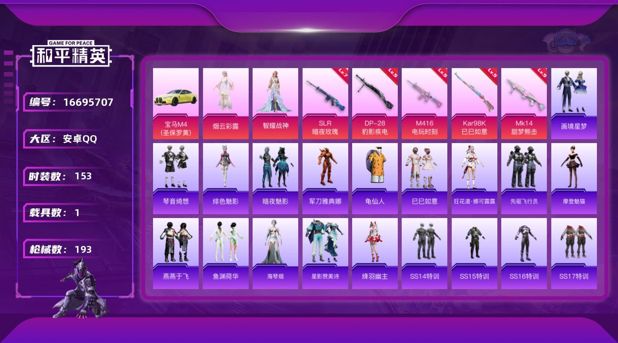 [16695707]【特价出售/店主推荐】安卓 手Q-2粉装-5特效枪-1载具-0粉色飞行器-58601热力值-11王牌印记-153套装-193枪皮