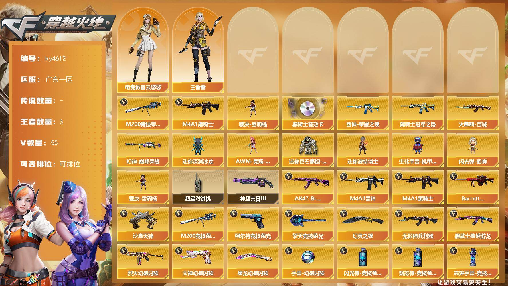 [16757704]广东一区-55V-3王者-0炫金 【热门武器】:M200-竞技荣光,M4A1-黑骑士,裁决-雪莉杨*2 【音效卡】:M4A1-黑骑士音效卡 【稀有皮肤】:幻神-巅峰荣耀,雷神-荣耀之魄,火麒麟-百城,黑骑士-冠军之势 【角色】:王者春,电竞教官-云悠悠 【人偶武器】:裁决-雪莉杨*2,AWM-灵狐-15周年嘉年华,迷你深渊冰龙,迷你巨石泰坦-魔花研究所,迷你波特博士,生化手雷-机甲核心,闪光弹-貂蝉 【暴走生化】:超级对讲机 【挑战大师】:神圣爆裂者-末日III 【英雄级武器】:M200-竞技荣光,柯尔特-竞技荣光*2,擎天-竞技荣光,高爆手雷-竞技荣光*7,烟雾弹-竞技荣光*8,闪光弹-竞技荣光*8,幻灵之锋,烈火-动感闪耀,天神-动感闪耀,屠龙-动感闪耀,手雷-动感闪耀,无影-神兵利器,M4A1-雷神,M4A1-黑骑士,Barrett-极光,黑武士-锦绣游龙,超新星-热带奇洋,AK-47-猩红传说,AK47-B-常胜将军,沙鹰-天神*2,龙啸-热带奇洋 【特殊枪械】:1黑骑士