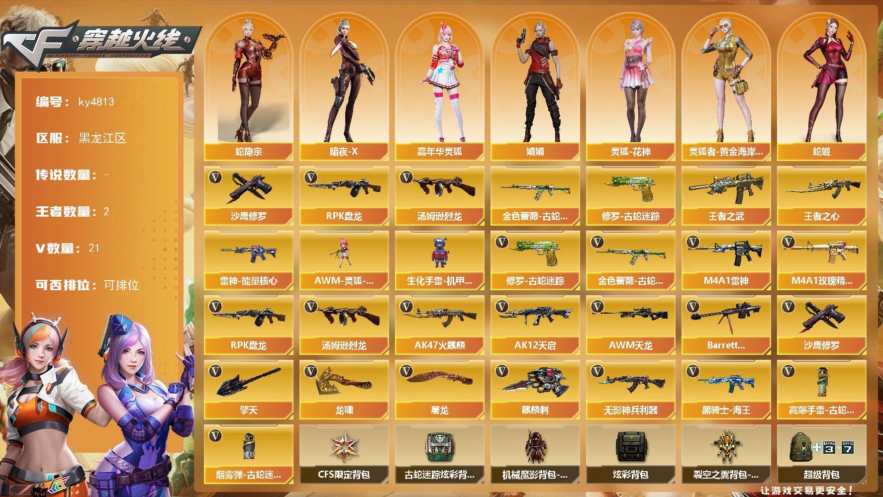 [16760875]黑龙江区-21V-2王者-0炫金 【热门武器】:金色蔷薇-古蛇迷踪,修罗-古蛇迷踪,汤姆逊-烈龙*3,RPK-盘龙,沙鹰-修罗*2 【王者炫金武器】:王者之武,王者之心 【皮肤】:雷神-能量核心 【角色】:蛇隐宗,暗夜-X,嘉年华灵狐,娟娟,0号玩家,灵狐-花神,灵狐者-黄金海岸,蛇姬,樱-战斗天使 【人偶武器】:AWM-灵狐-15周年嘉年华,生化手雷-机甲核心 【英雄级武器】:AK47-火麒麟,M4A1-雷神,AK12-天启,无影-神兵利器,金色蔷薇-古蛇迷踪,M4A1-玫瑰精灵,黑骑士-海王,AWM-天龙,Barrett-毁灭,RPK-盘龙,汤姆逊-烈龙*3,沙鹰-修罗*2,修罗-古蛇迷踪,屠龙*3,龙啸*2,擎天,麒麟刺,高爆手雷-古蛇迷踪,烟雾弹-古蛇迷踪 【道具】:CFS限定背包,古蛇迷踪炫彩背包,机械魔影背包-红色,炫彩背包,裂空之翼背包-金色,超级背包,黄金曼提柯尔的背包,夺命之镰,防化服,金色流光-枪王排位,星辰流光-枪王排位,枪王排位28赛季金色流光,枪王排位29赛季金色流光,古蛇迷踪打击特效,蛇隐宗表情,EP战队名片,EP战队喷图,EP战队击杀图标,防弹头盔,防弹衣,C4工具钳,手雷包 【特殊枪械】:3烈龙,1盘龙