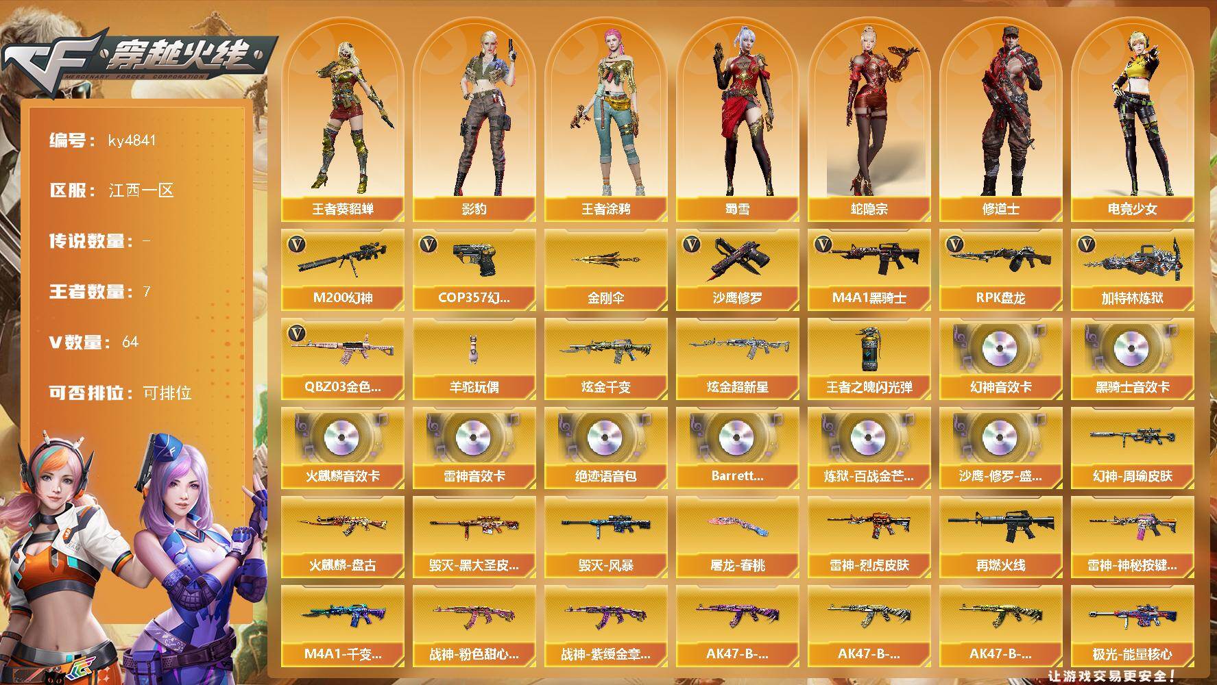 [16761684]江西一区-64V-7王者-2炫金 【传说角色】:传说星骇 【热门武器】:QBZ03-金色蔷薇,M200-幻神,M4A1-黑骑士,RPK-盘龙,加特林-炼狱,羊驼玩偶,COP 357-幻灵*2,沙鹰-修罗,金刚伞 【王者炫金武器】:炫金千变,炫金超新星,王者之魄闪光弹 【音效卡】:M200-幻神音效卡,AK47-火麒麟音效卡,M4A1-雷神音效卡,M4A1-黑骑士音效卡,绝迹语音包,Barrett-碧霄极光音效卡,炼狱-百战金芒-庆典舞曲音效卡,沙鹰-修罗-盛典舞曲音效卡 【皮肤】:幻神-周瑜皮肤,雷神-烈虎皮肤,M4A1-再燃火线,雷神-神秘按键 皮肤,火麒麟-盘古,毁灭-黑大圣皮肤,毁灭-风暴*2,M4A1-千变-孔明皮肤,战神-粉色甜心皮肤,战神-紫绶金章皮肤,AK47-B-常胜将军-曹操,AK47-B-常胜将军-刘备*2,AK47-B-常胜将军-孙权,极光-能量核心,修罗-能量核心,屠龙-春桃 皮肤,轻型军用手斧-再燃火线 【角色】:影豹,王者-葵-貂蝉,王者涂鸦,蛇隐宗,修道士,电竞少女,虎妞,嘉年华灵狐,兰-海滩派对,兰妹妹,0号玩家,龙儿,潘多拉-X,蛇姬,蜀雪 【人偶武器】:迷你深渊冰龙,迷你波特博士,夺魂,迷你牛牛,生化手雷-机甲核心*2,深渊终结者手雷,闪光弹-小乔,闪光弹-貂蝉,高爆手雷-大乔,迷你艾比 【暴走生化】:超级对讲机 【挑战大师】:冰龙粉碎者-白马银枪,机甲撕裂者III 【英雄级武器】:AK47-火麒麟,M4A1-雷神,M4A1-黑骑士,QBZ03-金色蔷薇,烈火-动感闪耀,AK-47-猩红传说,王者冰魄-觉醒版,王者火魄-觉醒版,黑骑士-海王,AK47-B-常胜将军,Barrett-毁灭,AWM-裁决,M200-幻神,RPK-盘龙,加特林-炼狱,炼狱-百战金芒,沙鹰-修罗,沙鹰-天神*3,COP 357-幻灵*2,Anaconda-玄豹,王者之魂-觉醒版,王者之灵-觉醒版,屠龙*4,龙啸,麒麟刺,幻灵之锋,麒麟刺-百战金芒,王者之锋-觉醒版,丛林匕首-玄豹,高爆手雷-幻灵*7,高爆手雷-古蛇迷踪,闪光弹-幻灵*8,烟雾弹-幻灵*7,烟雾弹-竞技荣光,烟雾弹-古蛇迷踪,烟雾弹-玄豹*2,M4A1-赤狱骑士,M4A1-苍鸣雷神 【道具】:BS战队炫彩背包,CFS限定背包,云山科技背包,百战金芒炫彩背包,超级背包*2,女皇终结者-魔龙之