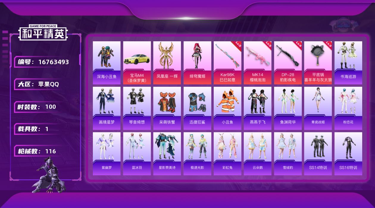 [16763493]苹果 手Q-2粉装-5特效枪-1载具-0粉色飞行器-35959热力值-8王牌印记-100套装-116枪皮 【热门品类】:套装-深海小丑鱼,套装-小丑鱼 【粉色套装】:角色-凤凰座 一辉,角色-绯穹魔姬 【粉色枪皮等级】:AKS-74U-森灵之息(四级),Kar98K-巳巳如意(五级),Mk14-樱桃泡泡(五级),DP-28-豹影疾电(四级),平底锅-喜羊羊与灰太狼(三级) 【粉色载具】:宝马M4(圣保罗黄) 【粉色枪皮】:AKS-74U-森灵之息,Kar98K-巳巳如意,Mk14-樱桃泡泡,DP-28-豹影疾电,平底锅-喜羊羊与灰太狼 【粉色降落伞】:银刃赛罗降落伞,蓝莓炮弹降落伞,樱桃泡泡降落伞,时光之吻降落伞,时光之誓降落伞,冷漠罗丽降落伞 【稀有套装】:套装-燕燕于飞,套装-鱼渊荷华,角色-青瓷战姬,套装-粉恋花,套装-紫幽梦,套装-蓝冰羽,套装-星影赞美诗,套装-极速光影,套装-彩虹兔,套装-云朵鹅,套装-雪绒豹,套装-书海巡游,套装-画境星梦,套装-琴音绮想 【稀有枪皮】:AKM-彩虹符号,AKM-生命誓言,AKM-破晓战魂,AKM-缤纷海域,AKM-虎虎生威,AKM-霓虹街区,M16A4-红色方程式,M16A4-雨林猎影,SCAR-L-炫彩节奏,SCAR-L-玉兔迎春,SCAR-L-红色方程式,M416-夜灯,M416-红色方程式,M416-蓝色火焰,GROZA-异彩先驱,GROZA-治愈之星,AUG-炫光贝贝,AUG-耀粉歌者,QBZ-赛罗,M762-瑞龙福将,M762-镭射皇者,M762-风花雪月,M762-云朵鹅,AC-VAL-天降萌叽,蜜獾-天降萌叽,ACE32-画境星梦,UZI-炫彩节奏,UMP45-生命誓言,UMP45-诡娃娃,Vector-彩虹符号,Vector-治愈之星,Vector-生命誓言,汤姆逊-异彩先驱,汤姆逊-炫彩节奏,汤姆逊-耀粉歌者,汤姆逊-银刃赛罗,汤姆逊-樱桃泡泡,MP5K-异彩先驱,MP5K-画境星梦,Kar98K-彩虹符号,Kar98K-炫彩节奏,M24-治愈之星,M24-炫彩节奏,M24-樱桃泡泡,SKS-炫彩节奏,SKS-迅猛狂鲨,Mini14-异彩先驱,Mini14-穿刺龙虾,Mini14-耀粉歌者,Mk14-治愈之星,Win94-瑞龙福将,MK20-H-樱桃泡泡,SVD-云朵鹅,M1加兰德-画境星梦,S68
