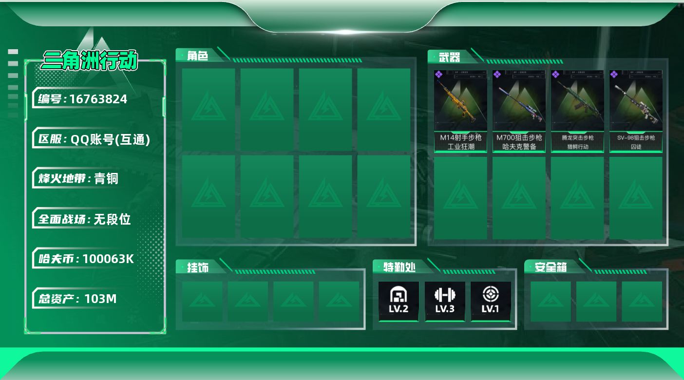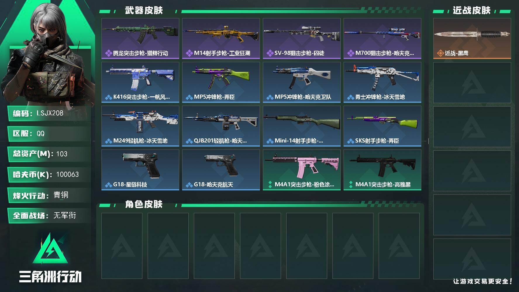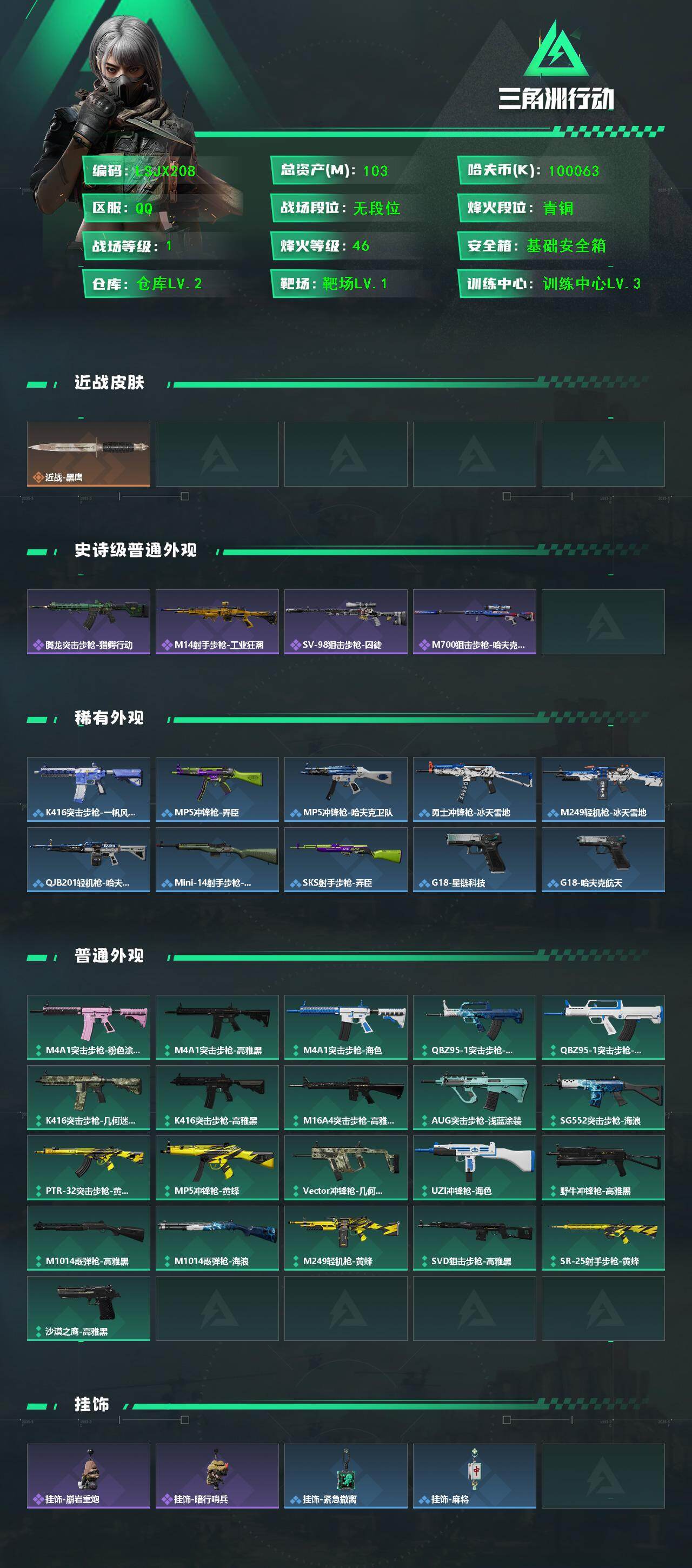 [16763824]【特价出售/店主推荐】103m总资产-100063k哈伏币-46烽火等级-青铜-1战场等级-无军衔 【近战皮肤】:近战-黑鹰 【史诗外观】:腾龙突击步枪-猎鳄行动,M14射手步枪-工业狂潮,SV-98狙击步枪-囚徒,M700狙击步枪-哈夫克警备 【稀有外观】:K416突击步枪-一帆风顺,MP5冲锋枪-弄臣,MP5冲锋枪-哈夫克卫队,勇士冲锋枪-冰天雪地,M249轻机枪-冰天雪地,QJB201轻机枪-哈夫克卫队,Mini-14射手步枪-荣耀列队,SKS射手步枪-弄臣,G18-星链科技,G18-哈夫克航天 【普通外观】:M4A1突击步枪-粉色涂装,M4A1突击步枪-高雅黑,M4A1突击步枪-海色,QBZ95-1突击步枪-海浪,QBZ95-1突击步枪-海色,QBZ95-1突击步枪-2026,K416突击步枪-几何迷彩,K416突击步枪-高雅黑,M16A4突击步枪-高雅黑,AUG突击步枪-浅蓝涂装,SG552突击步枪-海浪,PTR-32突击步枪-黄蜂,MP5冲锋枪-黄蜂,Vector冲锋枪-几何迷彩,UZI冲锋枪-海色,野牛冲锋枪-高雅黑,M1014霰弹枪-高雅黑,M1014霰弹枪-海浪,M249轻机枪-黄蜂,SVD狙击步枪-高雅黑,SR-25射手步枪-黄蜂,沙漠之鹰-高雅黑 【挂饰】:挂饰-崩岩重炮*2,挂饰-暗行哨兵,挂饰-紧急撤离*20,挂饰-麻将