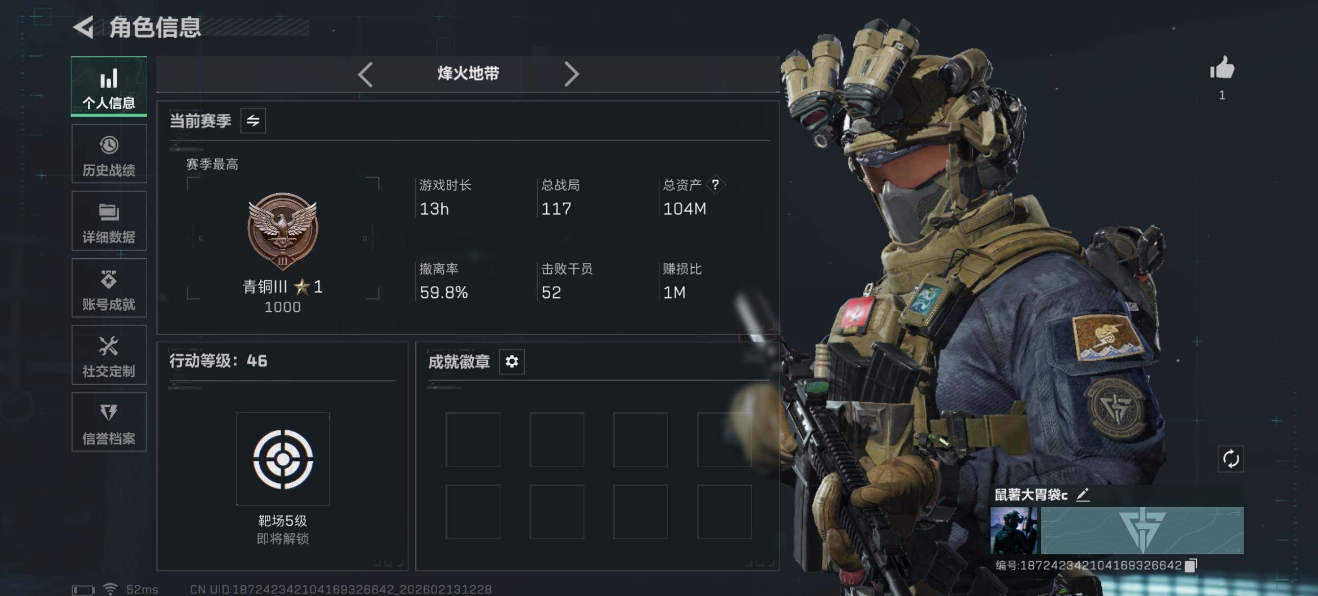 [16763824]【特价出售/店主推荐】103m总资产-100063k哈伏币-46烽火等级-青铜-1战场等级-无军衔