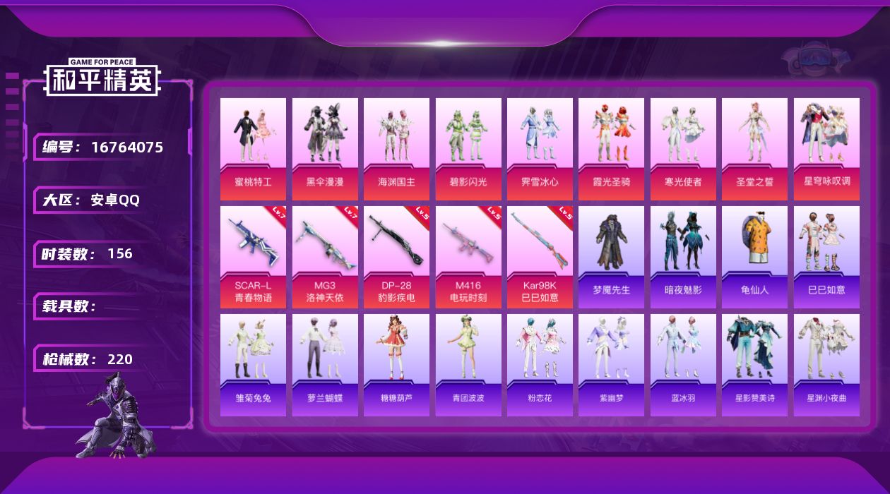 【粉色枪皮等级】:SCAR-L-青春物语(七级),M416-电玩时刻(五级),Kar98K-巳巳如意(五级),DP-28-豹影疾电(五级),MG3-洛神天依(七级)