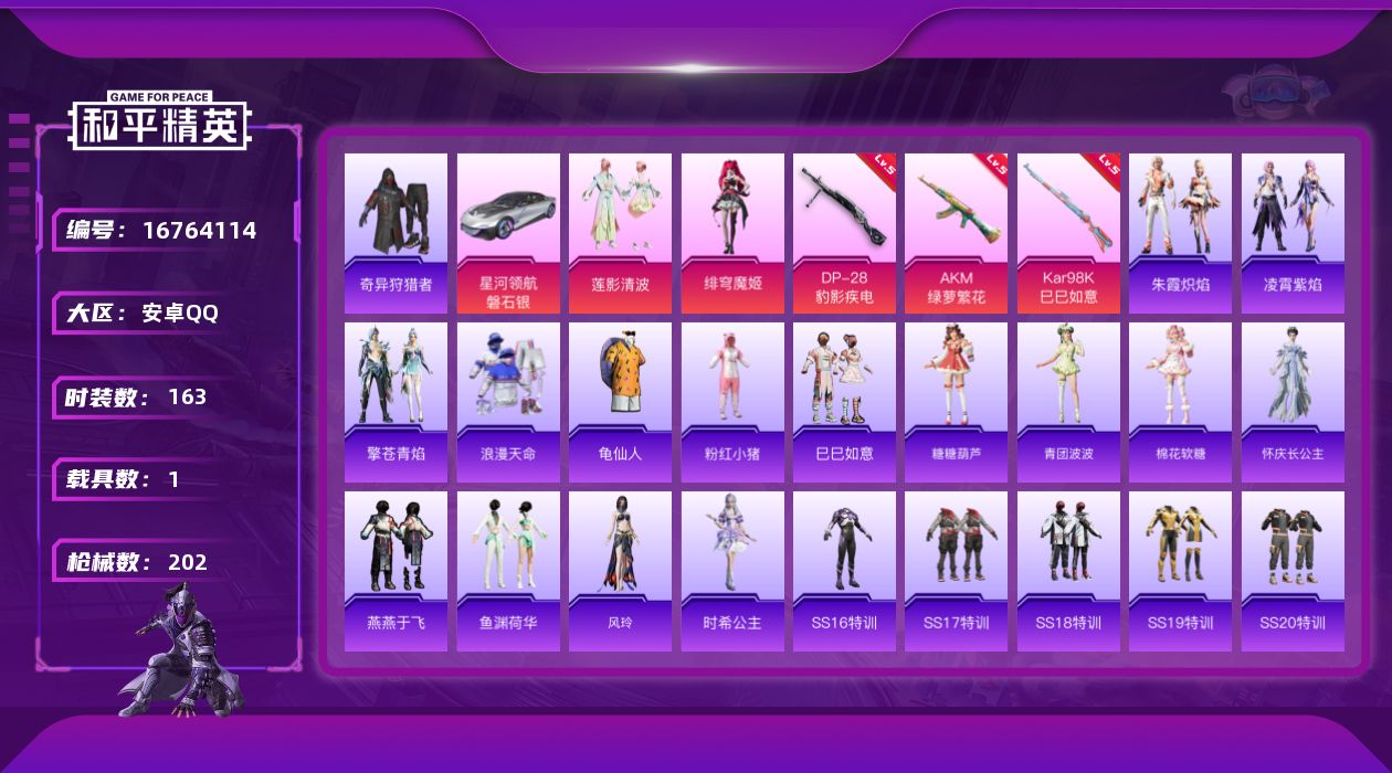 [16764114]安卓 手Q-2粉装-3特效枪-1载具-1粉色飞行器-56870热力值-13王牌印记-163套装-202枪皮 【热门品类】:套装-浪漫天命,套装-奇异狩猎者,套装-龟仙人,套装-粉红小猪 【粉色套装】:粉装-莲影清波,角色-绯穹魔姬 【粉色枪皮等级】:AKM-绿萝繁花(五级),Kar98K-巳巳如意(五级),DP-28-豹影疾电(五级) 【粉色载具】:星河领航(磐石银) 【粉色枪皮】:AKM-绿萝繁花,Kar98K-巳巳如意,DP-28-豹影疾电 【粉色降落伞】:星之彼岸降落伞,炙焰牛王降落伞,圣光天使降落伞,垂柳戏鸭降落伞,海螺星光降落伞,金丰海韵降落伞,月影灵韵降落伞,异瞳寒姬降落伞,炫彩糖果降落伞 【稀有套装】:套装-龟仙人,套装-巳巳如意,套装-雪国风尚,套装-炫彩糖果,套装-糖糖葫芦,套装-青团波波,套装-棉花软糖,角色-怀庆长公主,套装-燕燕于飞,套装-鱼渊荷华,角色-风玲,角色-时希公主,套装-朱霞炽焰,套装-凌霄紫焰,套装-擎苍青焰 【稀有枪皮】:AUG-冰晶雪宝,AKM-小鹦鹉BEBE,AKM-彩虹符号,AKM-灼热熔岩,AKM-破晓战魂,AKM-萌趣颜团子,AKM-虎虎生威,AKM-霓虹街区,AKM-龙的传人,M16A4-幻世战舞者,M16A4-甜心亚梦,M16A4-红色方程式,M16A4-蓝色火焰,SCAR-L-夜灯,SCAR-L-玉兔迎春,SCAR-L-红色方程式,SCAR-L-黄金龙骨,M416-夜灯,M416-糯团青竹,M416-红色方程式,M416-绯红前夜,M416-蓝色火焰,M416-诡夜天鹅,GROZA-彩虹符号,GROZA-影袭,GROZA-田园牧歌,AUG-天降萌叽,AUG-幻影战神,AUG-甜蜜菠萝,AUG-耀粉歌者,AUG-青春冒险家,QBZ-彩虹符号,M762-天降萌叽,M762-彩虹符号,M762-绯红前夜,AC-VAL-天降萌叽,AC-VAL-甜心亚梦,AC-VAL-闲梦青缨,蜜獾-千面幻镜,蜜獾-垂柳戏鸭,蜜獾-天降萌叽,蜜獾-娇憨猪猪,ARX-凌霄紫焰,UZI-啾咪啾咪,UZI-天降萌叽,UZI-娇憨猪猪,UZI-炫彩节奏,UZI-红色方程式,UZI-月影灵韵,UMP45-夜灯,UMP45-涂山之恋,UMP45-生命誓言,UMP45-蓝色火焰,Vector-彩虹符号,Vector-生命誓言,Vector-田园牧歌