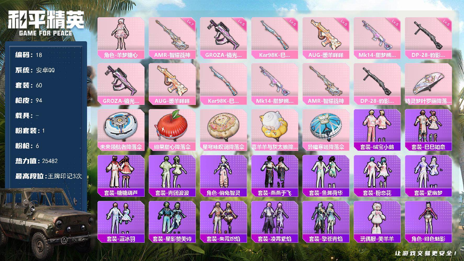 [16764293]安卓 手Q-1粉装-6特效枪-0载具-0粉色飞行器-25482热力值-3王牌印记-60套装-94枪皮