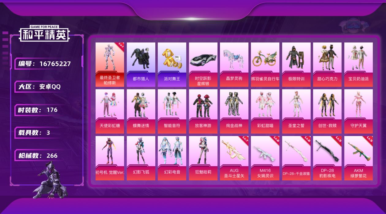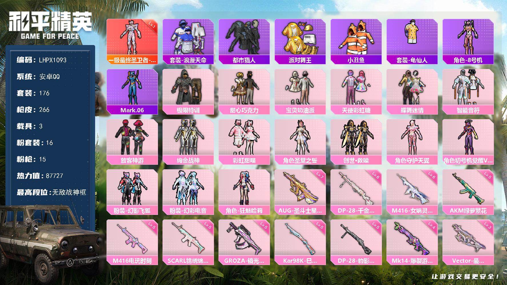 [16765227]【店主推荐捡漏号!可直接换绑】安卓 手Q-无敌战神框-1神装-16粉装-15特效枪-3载具-6粉色飞行器-87727热力值-15王牌印记-176套装-266枪皮 【红色神装等级】:最终圣卫者-帕修斯(一级)【红色角色神装】:最终圣卫者-帕修斯【热门品类】:套装-浪漫天命,套装-都市猎人,套装-派对舞王,套装-小丑鱼,套装-龟仙人,角色-8号机,角色-Mark.06【粉色套装】:粉装-极限特训,粉装-甜心巧克力,粉装-宝贝奶油派,粉装-天使彩虹糖,粉装-蝶舞迷情,粉装-智能音符,粉装-放客神游,粉装-绚金战神,粉装-彩虹甜喵,角色-圣堂之誓,套装-创世·救赎,角色-守护天翼,角色-初号机 觉醒Ver.,粉装-幻影飞狐,粉装-幻彩电音,角色-狂魅哈莉【粉色枪皮等级】:AKM-绿萝繁花(五级),SCAR-L-锦绣绵绵(五级),SCAR-L-魔童闹海 哪吒(三级),M416-电玩时刻(五级),M416-女娲灵识(六级),GROZA-镜光银凌(五级),AUG-圣斗士星矢(七级),Vector-最终圣卫者(三级),P90-魔童闹海 敖丙(三级),Kar98K-巳巳如意(五级),Mk14-爆裂游戏(四级),DP-28-圣堂之誓(一级),DP-28-千金淑猫(六级),DP-28-豹影疾电(五级)【粉色载具】:时空跃影(星辉银),晶梦灵驹,辉羽雀灵自行车【粉色枪皮】:AKM-绿萝繁花,SCAR-L-锦绣绵绵,SCAR-L-魔童闹海 哪吒,M416-电玩时刻,M416-女娲灵识,GROZA-镜光银凌,AUG-圣斗士星矢,Vector-最终圣卫者,P90-魔童闹海 敖丙,Kar98K-巳巳如意,Mk14-爆裂游戏,DP-28-圣堂之誓,DP-28-千金淑猫,DP-28-豹影疾电,破片手榴弹-秋玉花灯【粉色飞行器】:繁龙极客飞行器,龙翔九天飞行器,雀灵庇佑飞行器,终晖之翼飞行器,灵猫魔法师飞行器