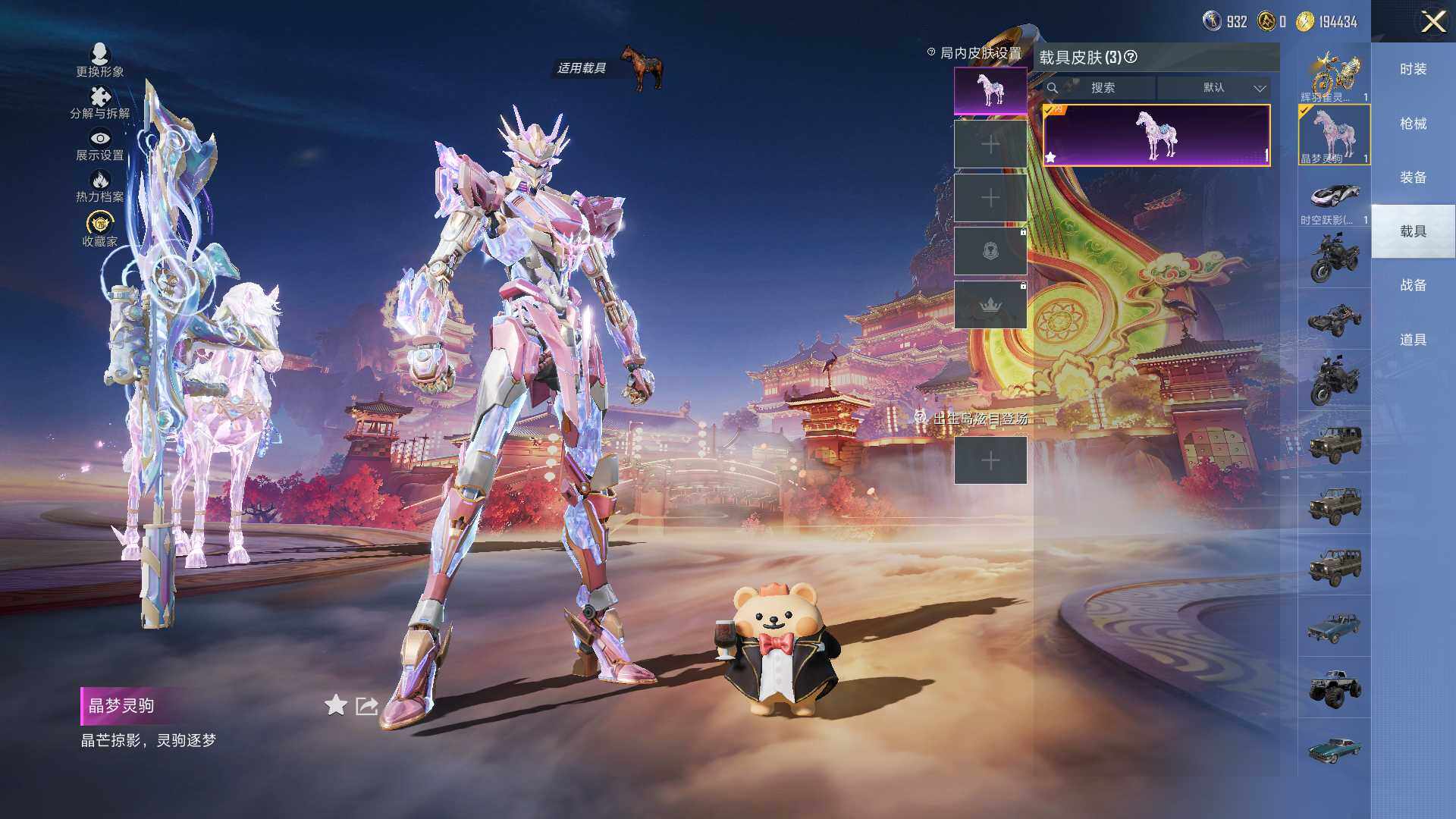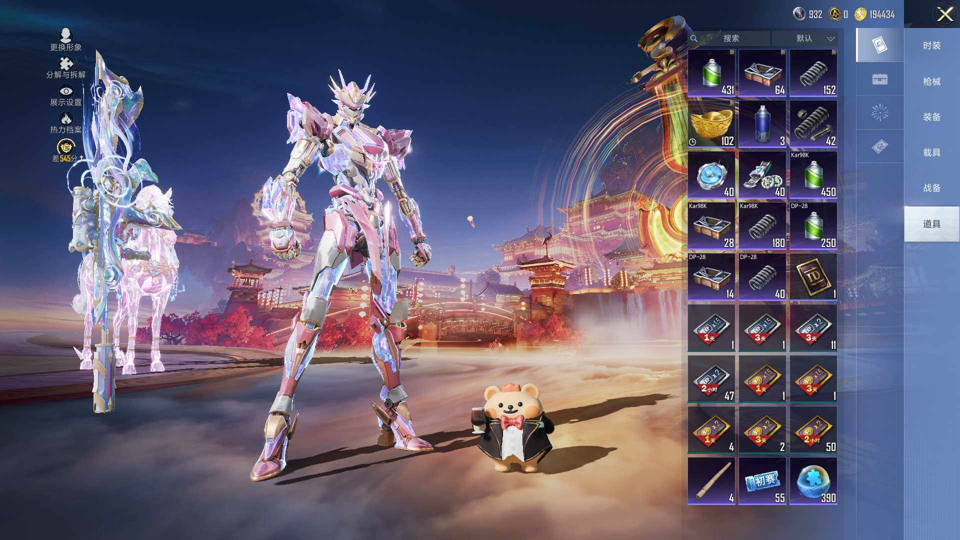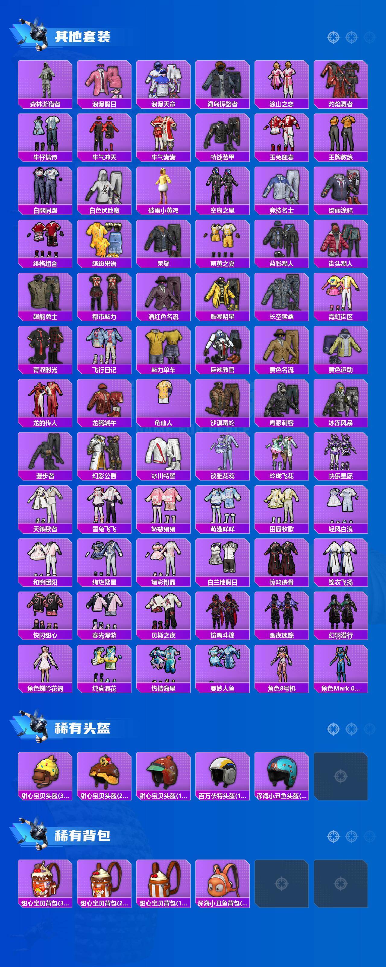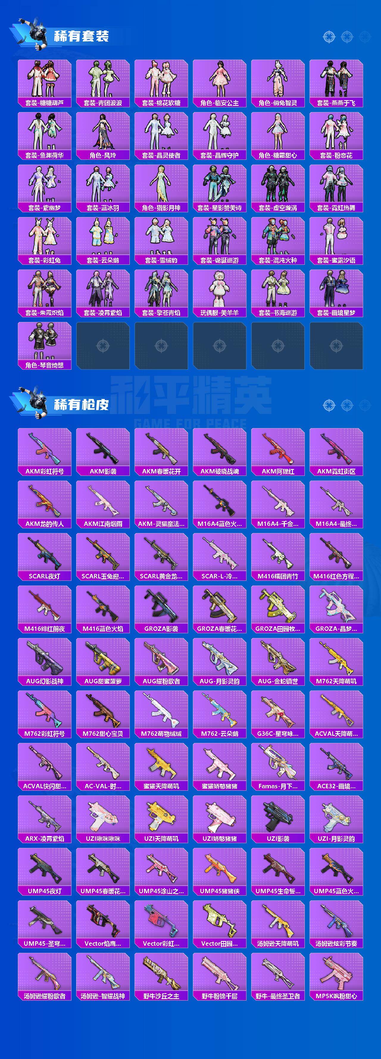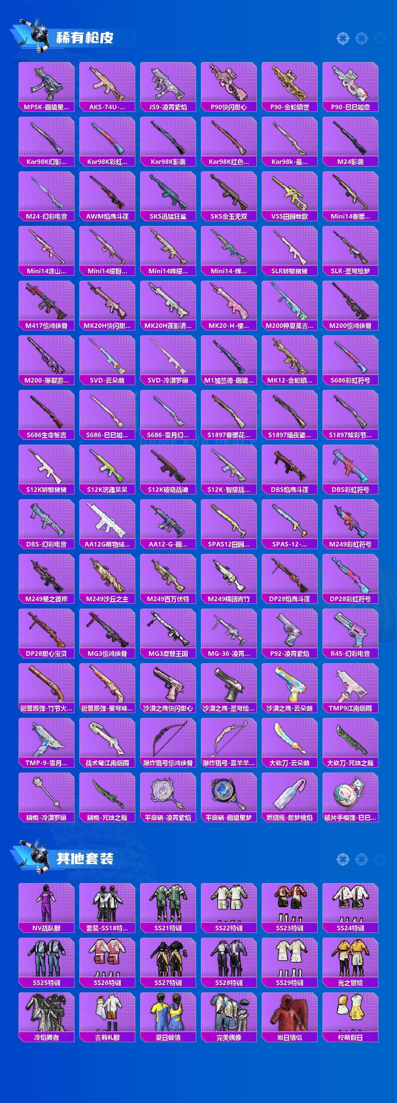 【红色神装等级】:最终圣卫者-帕修斯(一级)【红色角色神装】:最终圣卫者-帕修斯【热门品类】:套装-浪漫天命,套装-都市猎人,套装-派对舞王,套装-小丑鱼,套装-龟仙人,角色-8号机,角色-Mark.06【粉色套装】:粉装-极限特训,粉装-甜心巧克力,粉装-宝贝奶油派,粉装-天使彩虹糖,粉装-蝶舞迷情,粉装-智能音符,粉装-放客神游,粉装-绚金战神,粉装-彩虹甜喵,角色-圣堂之誓,套装-创世·救赎,角色-守护天翼,角色-初号机 觉醒Ver.,粉装-幻影飞狐,粉装-幻彩电音,角色-狂魅哈莉【粉色枪皮等级】:AKM-绿萝繁花(五级),SCAR-L-锦绣绵绵(五级),SCAR-L-魔童闹海 哪吒(三级),M416-电玩时刻(五级),M416-女娲灵识(六级),GROZA-镜光银凌(五级),AUG-圣斗士星矢(七级),Vector-最终圣卫者(三级),P90-魔童闹海 敖丙(三级),Kar98K-巳巳如意(五级),Mk14-爆裂游戏(四级),DP-28-圣堂之誓(一级),DP-28-千金淑猫(六级),DP-28-豹影疾电(五级)【粉色载具】:时空跃影(星辉银),晶梦灵驹,辉羽雀灵自行车【粉色枪皮】:AKM-绿萝繁花,SCAR-L-锦绣绵绵,SCAR-L-魔童闹海 哪吒,M416-电玩时刻,M416-女娲灵识,GROZA-镜光银凌,AUG-圣斗士星矢,Vector-最终圣卫者,P90-魔童闹海 敖丙,Kar98K-巳巳如意,Mk14-爆裂游戏,DP-28-圣堂之誓,DP-28-千金淑猫,DP-28-豹影疾电,破片手榴弹-秋玉花灯【粉色飞行器】:繁龙极客飞行器,龙翔九天飞行器,雀灵庇佑飞行器,终晖之翼飞行器,灵猫魔法师飞行器