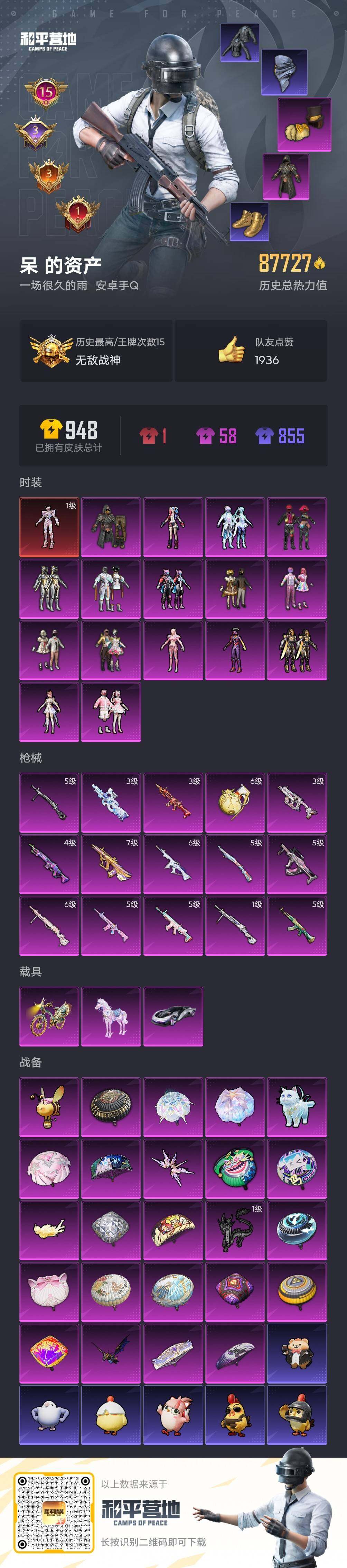 - PX_2106632-安卓QQ 历史总热力值:65964 粉装数量:6 特效枪数量:9 载具数量:1 王牌印记:7 历史最高段位:超级王牌11星 套装数量:146 时装数量:562 枪械数量:210 战备数量:137 装备数量:256 载具:宾利飞驰(布罗德盖棕双色) 时装:套装-傲傲奶龙,套装-放客神游,套装-蜜语绒猫,套装-闲梦青缨,角色-宙之时溯,角色-智耀战神,套装-SS11特训,套装-S