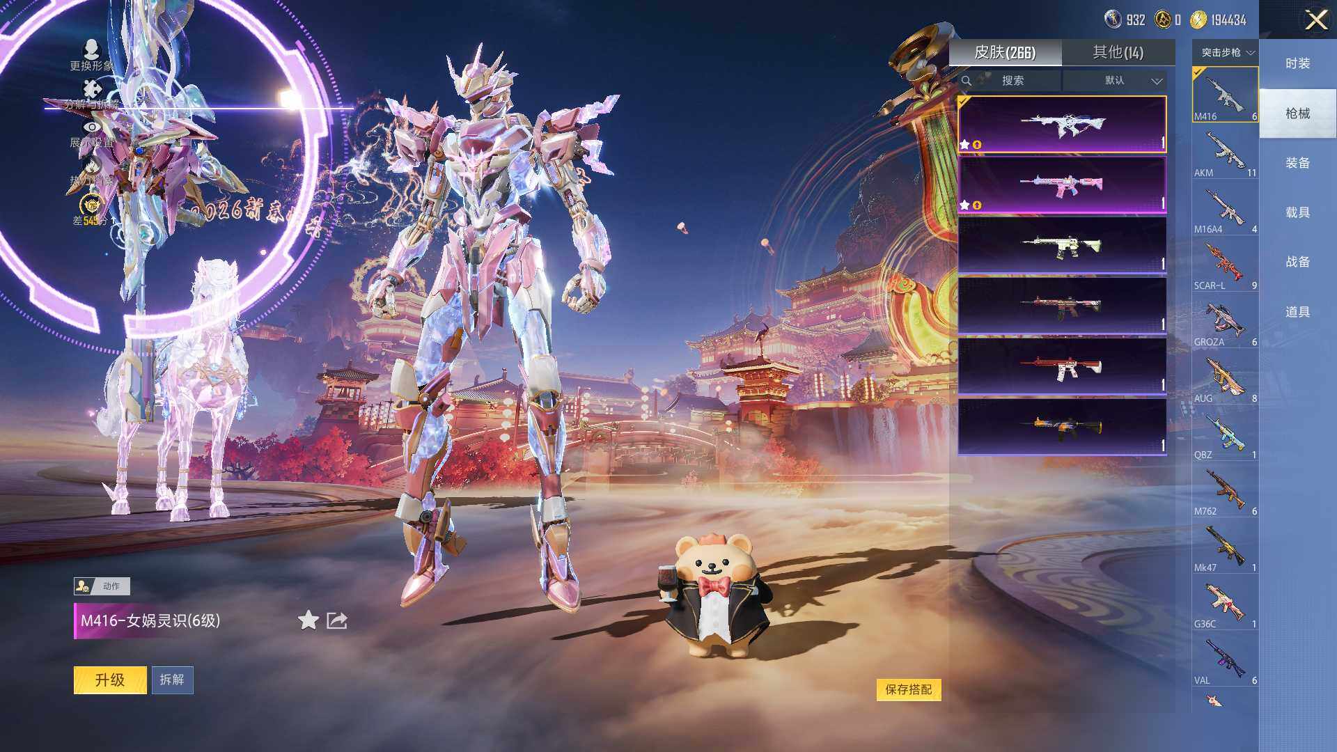 AKM-绿萝繁花,SCAR-L-锦绣绵绵,M416-电玩时刻,M416-女娲灵识,GROZA-镜光银凌,Kar98K-巳巳如意,DP-28-圣堂之誓,DP-28-千金淑猫,破片手榴弹-秋玉花灯