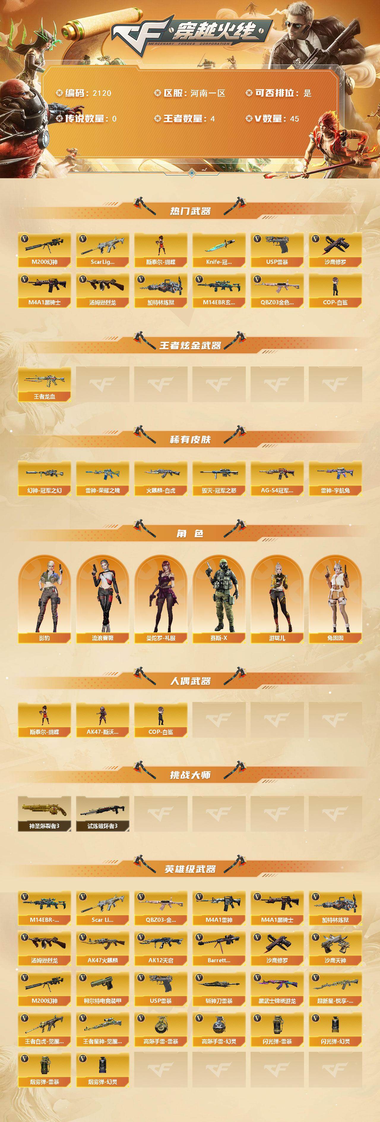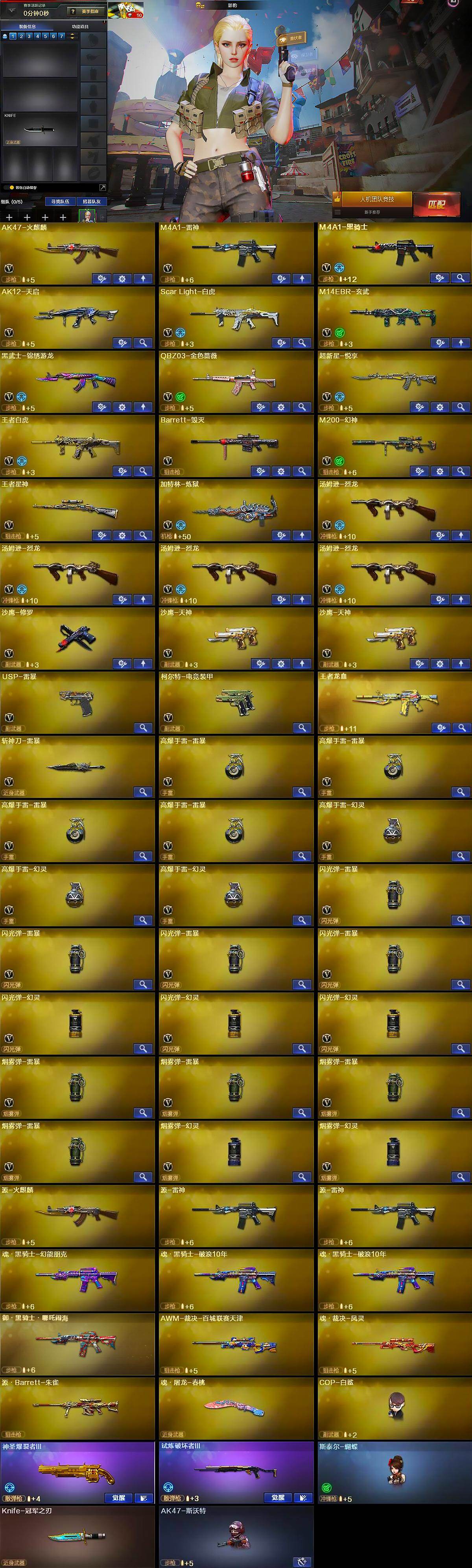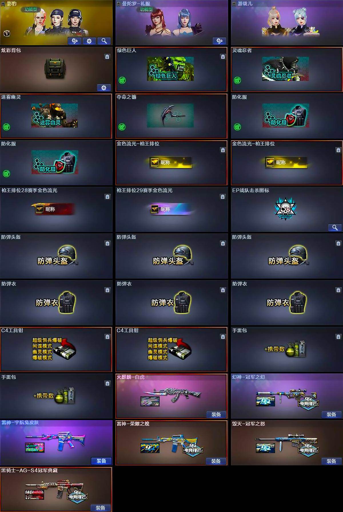 【英雄级武器】:AK47-火麒麟,M4A1-雷神,M4A1-黑骑士,AK12-天启,Scar Light-白虎,M14EBR-玄武,黑武士-锦绣游龙,QBZ03-金色蔷薇,超新星-悦享-觉醒版,王者白虎-觉醒版,Barrett-毁灭,M200-幻神,王者星神-觉醒版,加特林-炼狱,汤姆逊-烈龙*4,沙鹰-修罗,沙鹰-天神*2,USP-雷暴,柯尔特-电竞装甲,斩神刀-雷暴,高爆手雷-雷暴*4,高爆手雷-幻灵*3,闪光弹-雷暴*4,闪光弹-幻灵*3,烟雾弹-雷暴*4,烟雾弹-幻灵*2