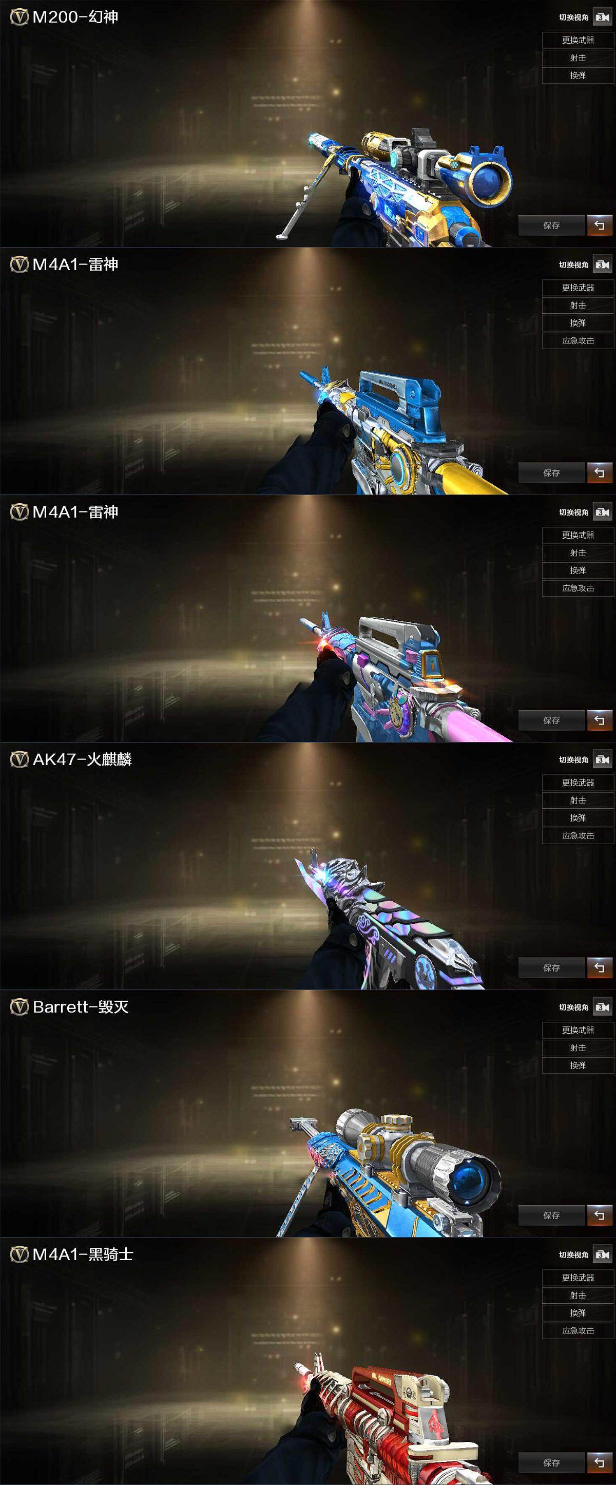 【热门武器】:QBZ03-金色蔷薇,M14EBR-玄武,Scar Light-白虎,M200-幻神,M4A1-黑骑士,汤姆逊-烈龙*4,加特林-炼狱,斯泰尔-蝴蝶,COP-白鲨,USP-雷暴,沙鹰-修罗,Knife-冠军之刃