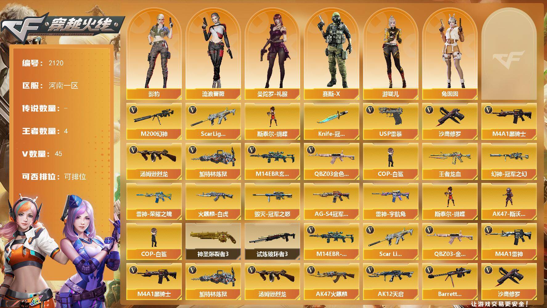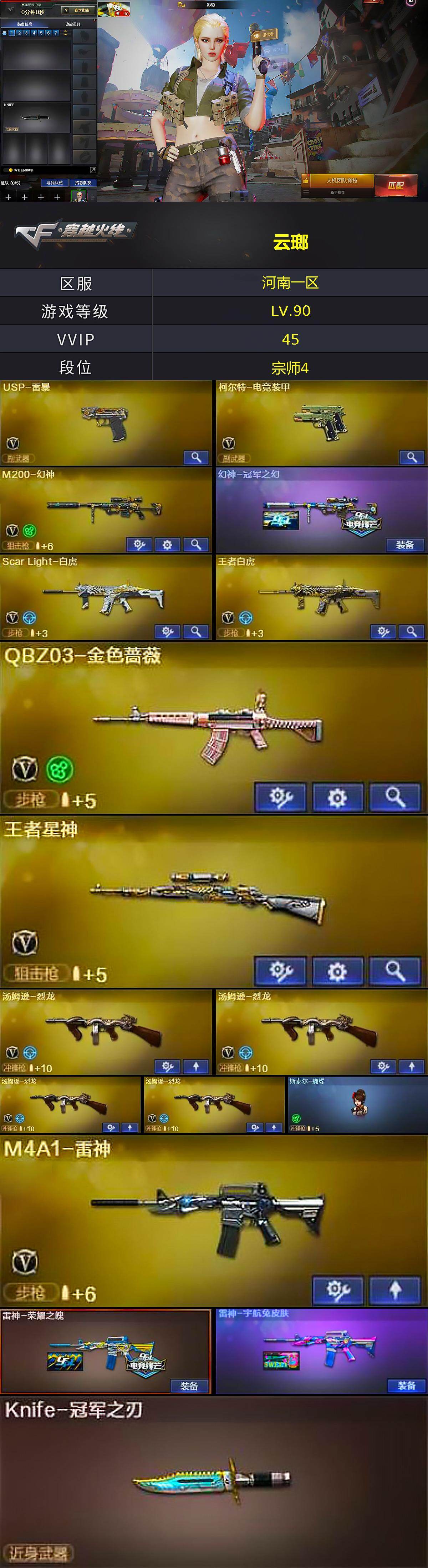 [16765608]河南一区-48V-4王者武器数-0炫金武器数 【热门武器】:QBZ03-金色蔷薇,M14EBR-玄武,Scar Light-白虎,M200-幻神,M4A1-黑骑士,汤姆逊-烈龙*4,加特林-炼狱,斯泰尔-蝴蝶,COP-白鲨,USP-雷暴,沙鹰-修罗,Knife-冠军之刃 【王者炫金武器】:王者龙血 【皮肤】:幻神-冠军之幻,雷神-荣耀之魄,雷神-宇航兔皮肤,火麒麟-白虎,毁灭-冠军之怒,黑骑士-AG-S4冠军典藏 【角色】:影豹,流浪蔷薇,曼陀罗-礼服,赛斯-X,兔囡囡,游珑儿 【人偶武器】:COP-白鲨,斯泰尔-蝴蝶,AK47-斯沃特 【挑战大师】:神圣爆裂者III,试炼破坏者III 【英雄级武器】:AK47-火麒麟,M4A1-雷神,M4A1-黑骑士,AK12-天启,Scar Light-白虎,M14EBR-玄武,黑武士-锦绣游龙,QBZ03-金色蔷薇,超新星-悦享-觉醒版,王者白虎-觉醒版,Barrett-毁灭,M200-幻神,王者星神-觉醒版,加特林-炼狱,汤姆逊-烈龙*4,沙鹰-修罗,沙鹰-天神*2,USP-雷暴,柯尔特-电竞装甲,斩神刀-雷暴,高爆手雷-雷暴*4,高爆手雷-幻灵*3,闪光弹-雷暴*4,闪光弹-幻灵*3,烟雾弹-雷暴*4,烟雾弹-幻灵*2 【道具】:炫彩背包,绿色巨人,灵魂忍者,迷雾幽灵,夺命之镰,防化服*2,金色流光-枪王排位*2,枪王排位28赛季金色流光,枪王排位29赛季金色流光,EP战队击杀图标,防弹头盔*3,防弹衣*3,C4工具钳*2,手雷包*2 【特殊枪械】:蝴蝶斯泰尔+4烈龙,1白虎,1黑骑士,4烈龙,1炼狱,1蝴蝶斯泰尔