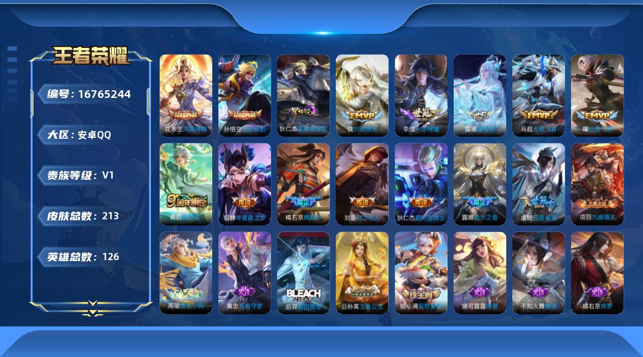 [16765244]【特价出售/店主推荐】安卓Q-V0-永恒钻石I段位-126英雄-213皮肤-2典藏皮肤-12传说-59史诗-2星元