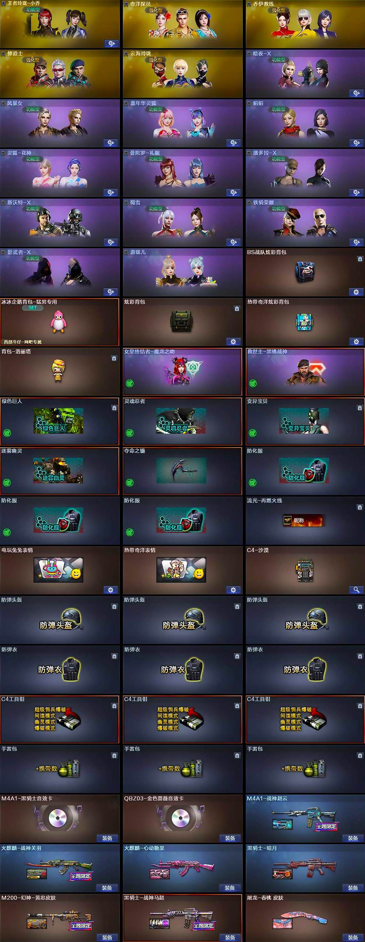 【道具】:BS战队炫彩背包,冰冰企鹅背包-猛男专用,炫彩背包,热带奇洋炫彩背包,背包-洛丽塔,女皇终结者-魔龙之吻,救世主-黑桃战神,绿色巨人,灵魂忍者,变异宝贝,迷雾幽灵,夺命之镰,防化服*3,流光-再燃火线,电玩兔兔表情,热带奇洋表情,C4-沙漠,防弹头盔*3,防弹衣*3,C4工具钳*3,手雷包*3