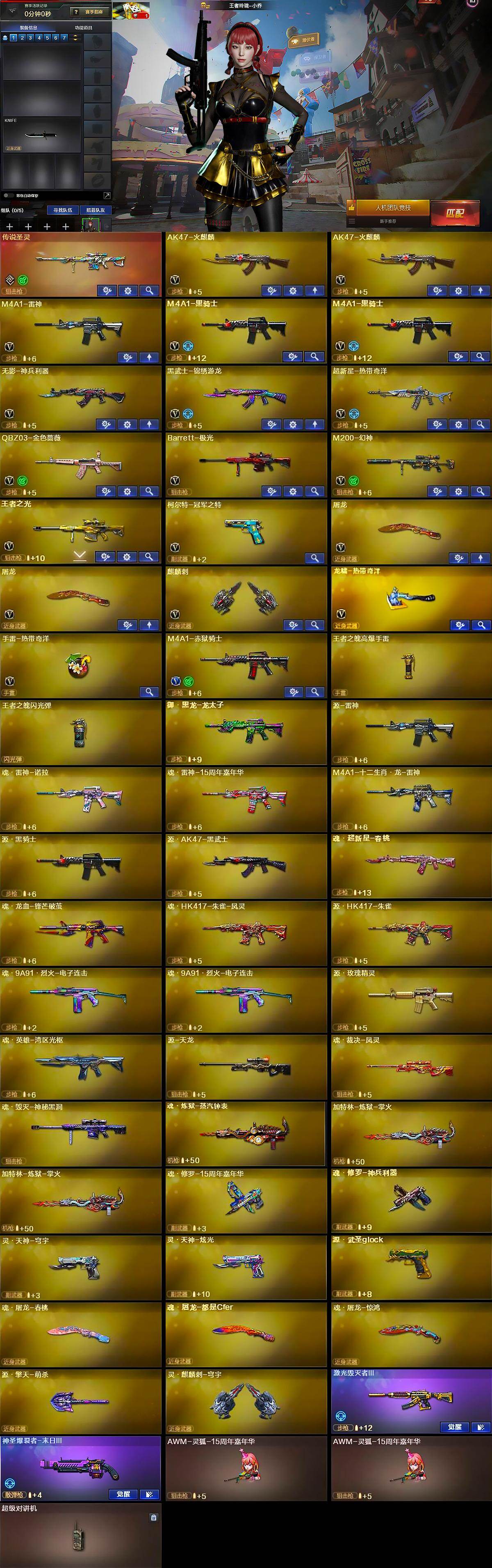 【英雄级武器】:AK47-火麒麟*2,M4A1-雷神,M4A1-黑骑士*2,无影-神兵利器,黑武士-锦绣游龙,超新星-热带奇洋,QBZ03-金色蔷薇,Barrett-极光,M200-幻神,王者之光-觉醒版,柯尔特-冠军之特,屠龙*2,麒麟刺,龙啸-热带奇洋,手雷-热带奇洋,M4A1-赤狱骑士