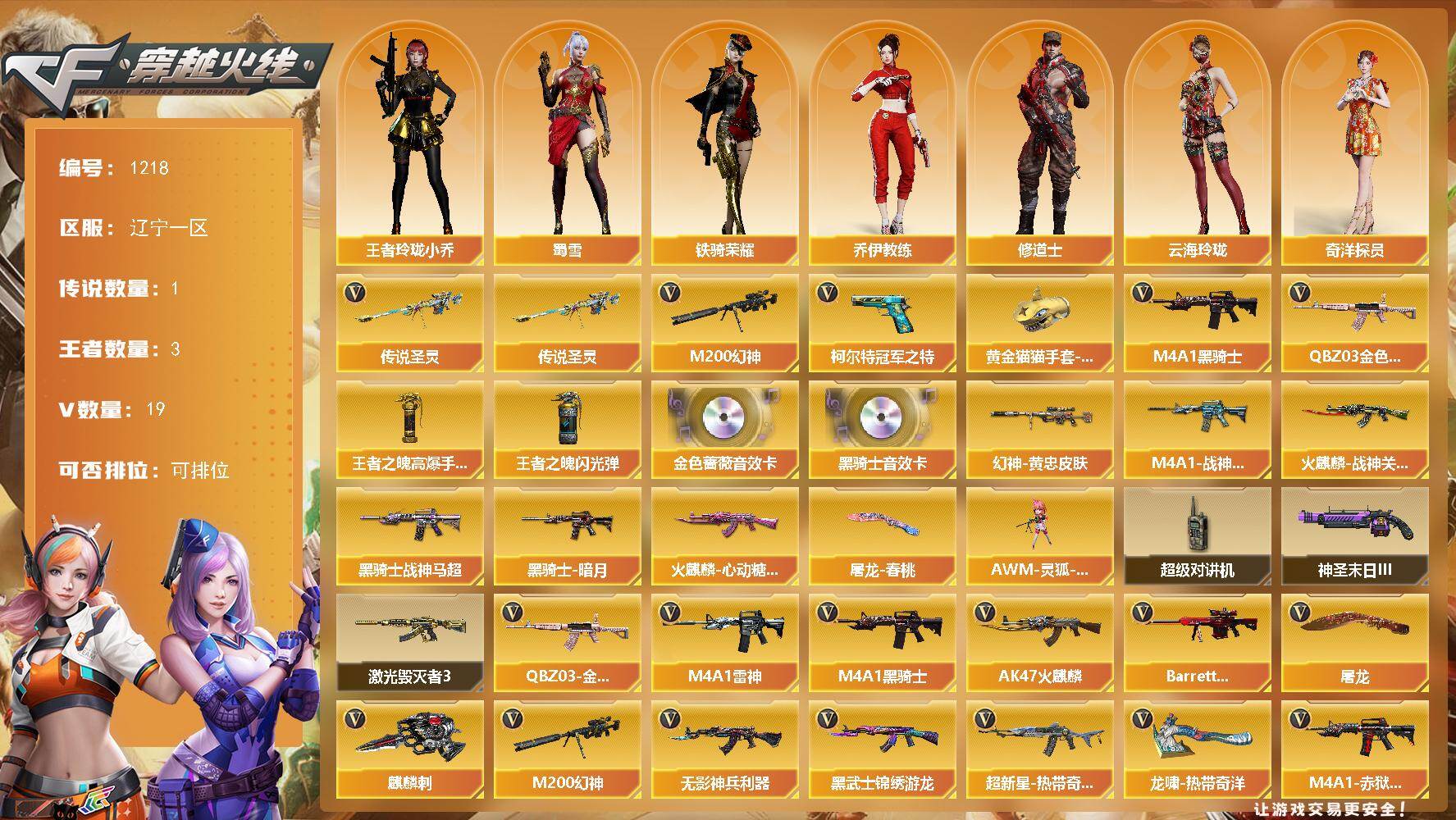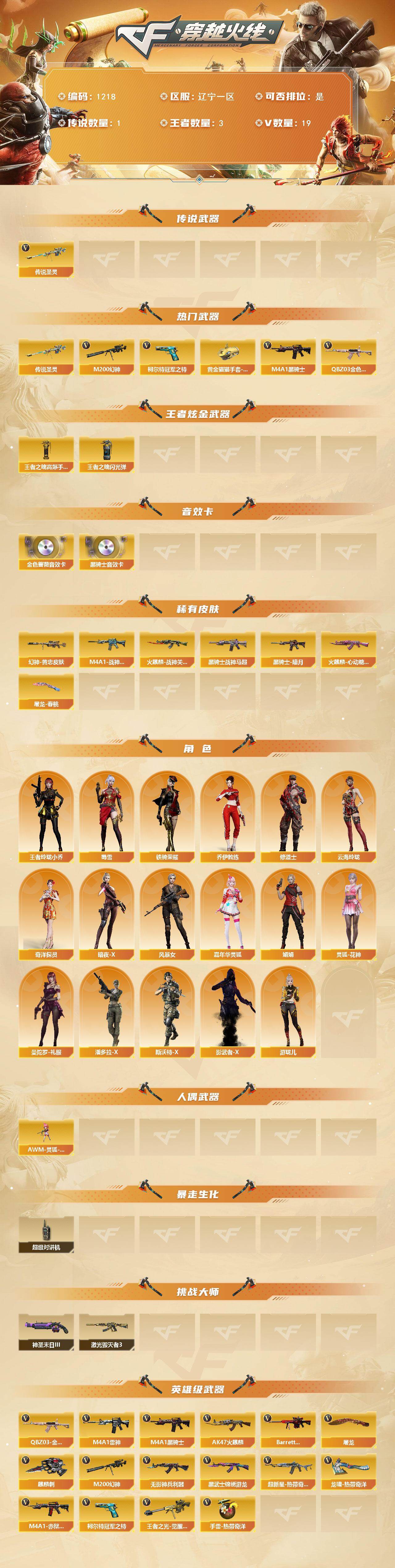 [16765622]辽宁一区-18V-3王者武器数-0炫金武器数 【传说武器】:传说圣灵 【热门武器】:传说圣灵,QBZ03-金色蔷薇,M200-幻神,柯尔特-冠军之特,M4A1-黑骑士*2,黄金猫猫手套-白鲨 【王者炫金武器】:王者之魄高爆手雷,王者之魄闪光弹 【音效卡】:M4A1-黑骑士音效卡,QBZ03-金色蔷薇音效卡 【皮肤】:M200-幻神-黄忠皮肤,M4A1-战神赵云,火麒麟-战神关羽,火麒麟-心动糖果,黑骑士-暗月,黑骑士-战神马超,屠龙-春桃 皮肤 【角色】:王者玲珑-小乔,奇洋探员,乔伊教练,修道士,云海玲珑,暗夜-X,风暴女,嘉年华灵狐,娟娟,灵狐-花神,曼陀罗-礼服,潘多拉-X,斯沃特-X,蜀雪,铁骑荣耀,影武者-X,游珑儿 【人偶武器】:AWM-灵狐-15周年嘉年华*2 【暴走生化】:超级对讲机 【挑战大师】:激光毁灭者III,神圣爆裂者-末日III 【英雄级武器】:AK47-火麒麟*2,M4A1-雷神,M4A1-黑骑士*2,无影-神兵利器,黑武士-锦绣游龙,超新星-热带奇洋,QBZ03-金色蔷薇,Barrett-极光,M200-幻神,王者之光-觉醒版,柯尔特-冠军之特,屠龙*2,麒麟刺,龙啸-热带奇洋,手雷-热带奇洋,M4A1-赤狱骑士 【道具】:BS战队炫彩背包,冰冰企鹅背包-猛男专用,炫彩背包,热带奇洋炫彩背包,背包-洛丽塔,女皇终结者-魔龙之吻,救世主-黑桃战神,绿色巨人,灵魂忍者,变异宝贝,迷雾幽灵,夺命之镰,防化服*3,流光-再燃火线,电玩兔兔表情,热带奇洋表情,C4-沙漠,防弹头盔*3,防弹衣*3,C4工具钳*3,手雷包*3 【特殊枪械】:2黑骑士
