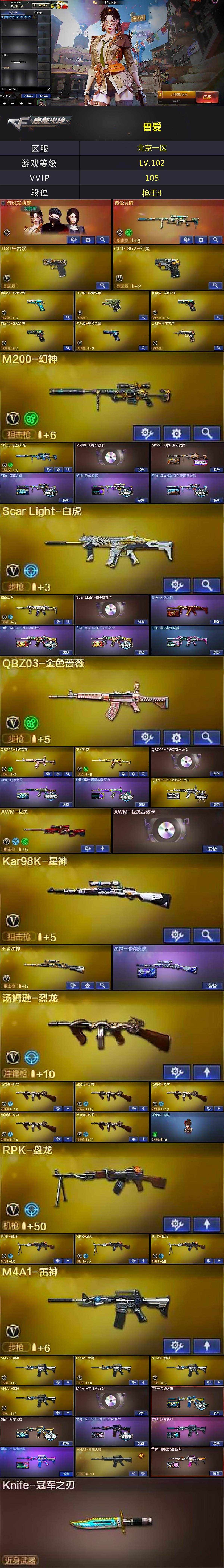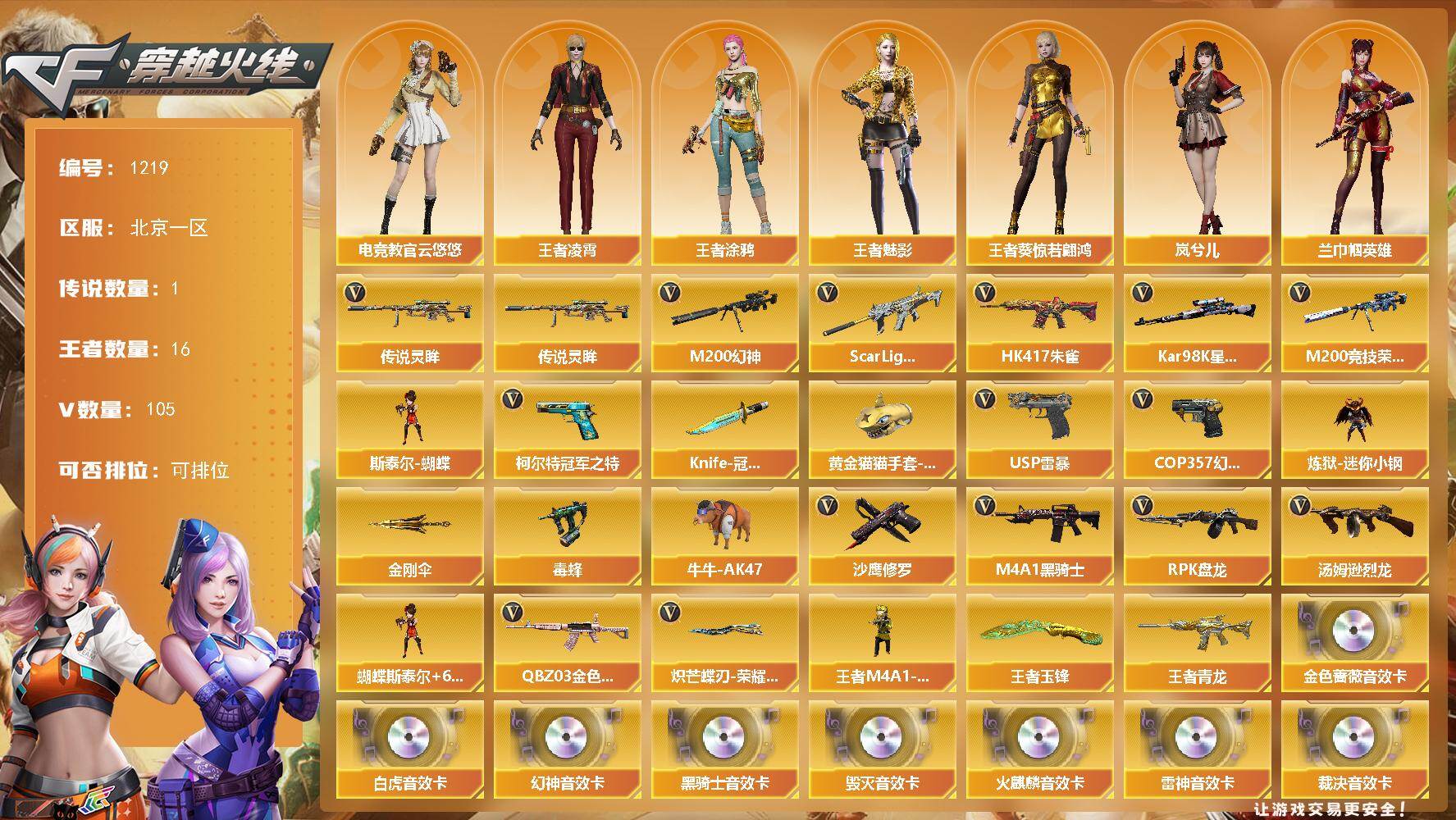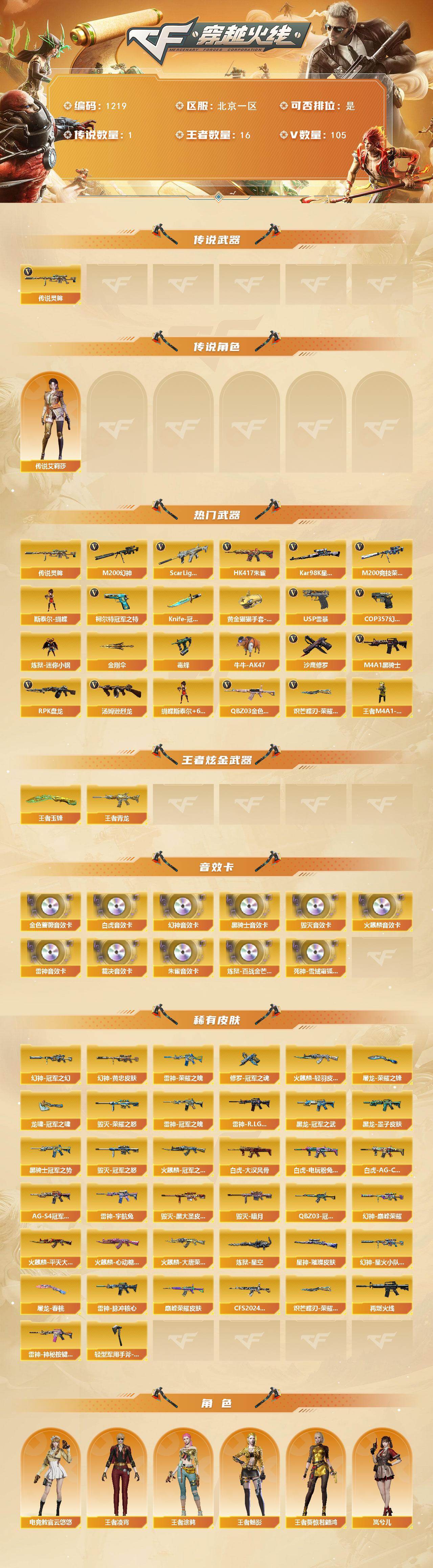 [16765859]北京一区-110V-16王者武器数-0炫金武器数 【传说武器】:传说灵眸 【传说角色】:传说艾莉莎 【热门武器】:传说灵眸,QBZ03-金色蔷薇*2,Scar Light-白虎,HK417-朱雀,M200-幻神,M200-竞技荣光,柯尔特-冠军之特,Kar98K-星神,炼狱-迷你小钢,毒蜂,牛牛-AK47,M4A1-黑骑士,汤姆逊-烈龙*6,RPK-盘龙*4,斯泰尔-蝴蝶,王者M4A1-萌萌金发刀锋,USP-雷暴,COP 357-幻灵,沙鹰-修罗*3,Knife-冠军之刃,炽芒蝶刃-荣耀世冠白鲨2023 皮肤,黄金猫猫手套-白鲨,金刚伞 【王者炫金武器】:王者青龙,王者玉锋 【音效卡】:M200-幻神音效卡,AK47-火麒麟音效卡,M4A1-雷神音效卡,M4A1-黑骑士音效卡,Barrett-毁灭音效卡,QBZ03-金色蔷薇音效卡,AWM-裁决音效卡,Scar Light-白虎音效卡,HK417-朱雀音效卡,炼狱-百战金芒-庆典舞曲音效卡,死神-雪域霜狐-怀旧音效卡 【皮肤】:M200-幻神-黄忠皮肤,幻神-冠军之幻,幻神-巅峰荣耀,幻神-星火小队签名臻藏版 皮肤,白虎-大汉风骨,白虎-AG-CFPLS20冠军*2,白虎-电玩粉兔皮肤,QBZ03-冠军之薇,QBZ03-巅峰荣耀皮肤,QBZ03-CFS2024 皮肤,星神-璀璨皮肤,雷神-荣耀之魄,雷神-冠军之魄,雷神-R.LGD-CFPLS18冠军,雷神-脉冲核心,雷神-宇航兔皮肤,M4A1-再燃火线,雷神-神秘按键 皮肤,火麒麟-冠军之心,火麒麟-轻羽皮肤,火麒麟-平天大圣*2,火麒麟-大唐荣光,火麒麟-心动糖果,毁灭-暗月,毁灭-荣耀之怒,毁灭-冠军之怒,毁灭-黑大圣皮肤,黑龙-墨子皮肤,黑龙-冠军之武,黑骑士-冠军之势,黑骑士-AG-S4冠军典藏,炼狱-星空,修罗-冠军之魂,屠龙-荣耀之锋,屠龙-春桃 皮肤,龙啸-冠军之啸,轻型军用手斧-再燃火线,炽芒蝶刃-荣耀世冠白鲨2023 皮肤 【角色】:电竞教官-云悠悠,兰-巾帼英雄,岚兮儿,战地猎狐,王者葵-惊若翩鸿,王者凌霄,王者涂鸦,王者-魅影,王者潘多拉,雪域霜狐,奇洋探员,乔伊教练,修道士,云海玲珑,暗夜-X,初恋灵狐,芳心审判者,嘉年华灵狐,灵狐者-X,灵狐者-黄金海岸,灵狐者-七夕宝贝,龙儿-小淘气,麻雀,曼陀罗-X,潘多拉-X,潘多拉-甜心教官,青霞