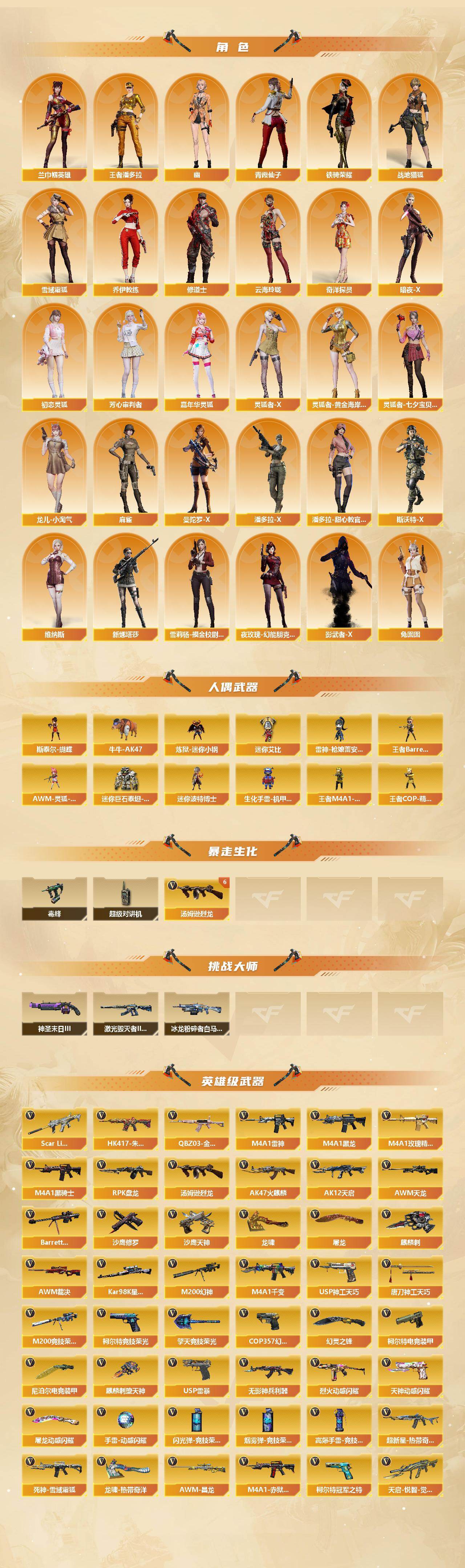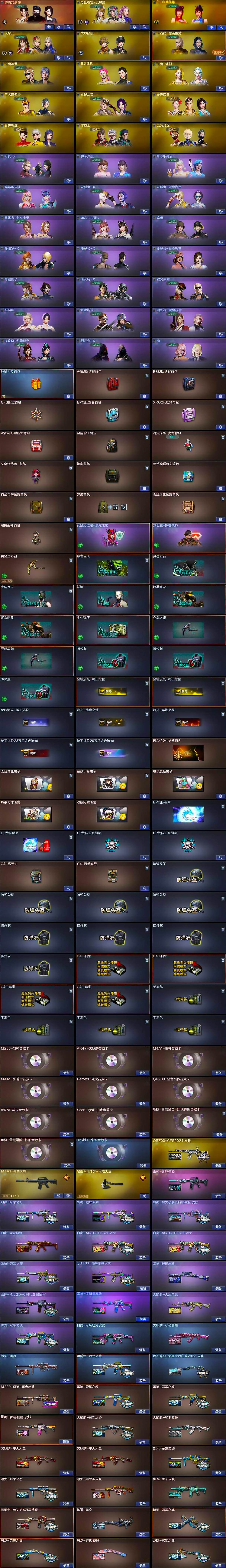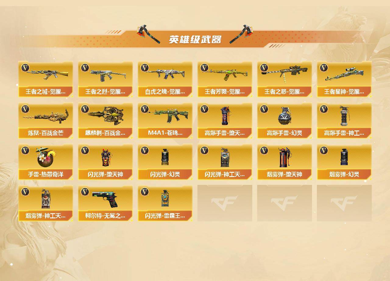 【皮肤】:M200-幻神-黄忠皮肤,幻神-冠军之幻,幻神-巅峰荣耀,幻神-星火小队签名臻藏版 皮肤,白虎-大汉风骨,白虎-AG-CFPLS20冠军*2,白虎-电玩粉兔皮肤,QBZ03-冠军之薇,QBZ03-巅峰荣耀皮肤,QBZ03-CFS2024 皮肤,星神-璀璨皮肤,雷神-荣耀之魄,雷神-冠军之魄,雷神-R.LGD-CFPLS18冠军,雷神-脉冲核心,雷神-宇航兔皮肤,M4A1-再燃火线,雷神-神秘按键 皮肤,火麒麟-冠军之心,火麒麟-轻羽皮肤,火麒麟-平天大圣*2,火麒麟-大唐荣光,火麒麟-心动糖果,毁灭-暗月,毁灭-荣耀之怒,毁灭-冠军之怒,毁灭-黑大圣皮肤,黑龙-墨子皮肤,黑龙-冠军之武,黑骑士-冠军之势,黑骑士-AG-S4冠军典藏,炼狱-星空,修罗-冠军之魂,屠龙-荣耀之锋,屠龙-春桃 皮肤,龙啸-冠军之啸,轻型军用手斧-再燃火线,炽芒蝶刃-荣耀世冠白鲨2023 皮肤