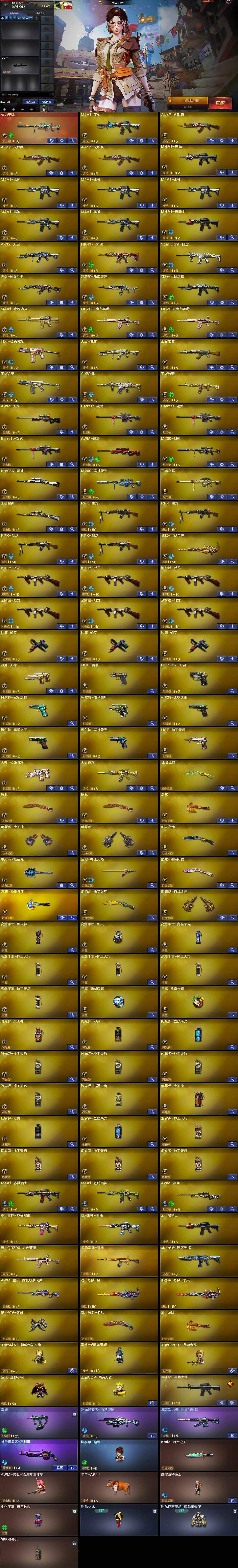 【热门武器】:传说灵眸,QBZ03-金色蔷薇*2,Scar Light-白虎,HK417-朱雀,M200-幻神,M200-竞技荣光,柯尔特-冠军之特,Kar98K-星神,炼狱-迷你小钢,毒蜂,牛牛-AK47,M4A1-黑骑士,汤姆逊-烈龙*6,RPK-盘龙*4,斯泰尔-蝴蝶,王者M4A1-萌萌金发刀锋,USP-雷暴,COP 357-幻灵,沙鹰-修罗*3,Knife-冠军之刃,炽芒蝶刃-荣耀世冠白鲨2023 皮肤,黄金猫猫手套-白鲨,金刚伞