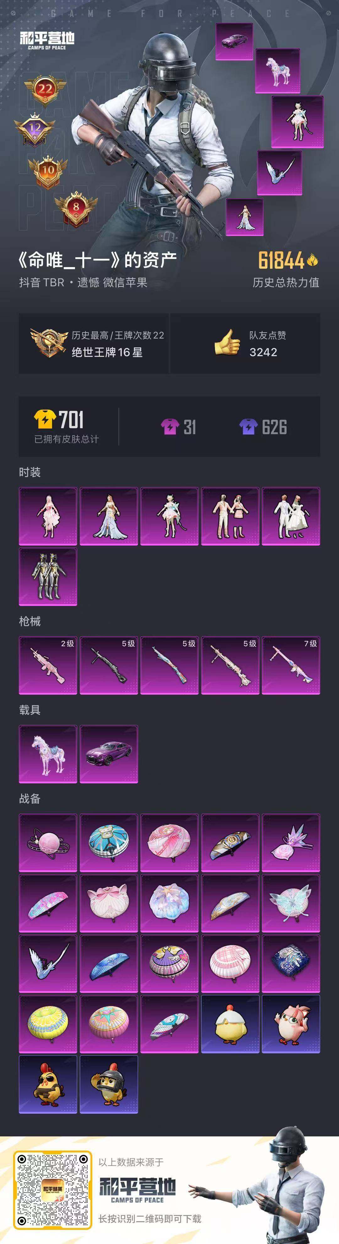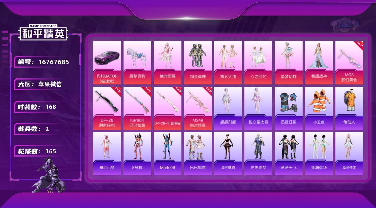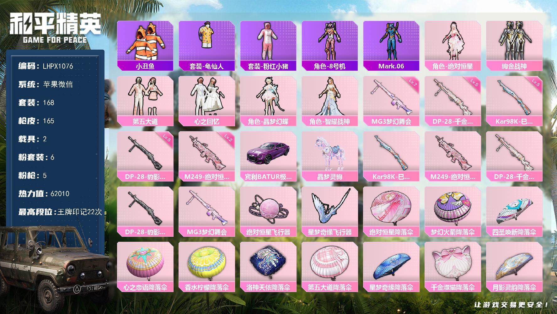 [16767685]【特价出售/店主推荐】苹果 微信-6粉装-5特效枪-2载具-3粉色飞行器-62010热力值-22王牌印记-168套装-165枪皮 【热门品类】:套装-小丑鱼,套装-龟仙人,套装-粉红小猪,角色-8号机,角色-Mark.06 【粉色套装】:角色-绝对恒星,粉装-绚金战神,粉装-第五大道,粉装-心之回忆,角色-晶梦幻蝶,角色-智耀战神 【粉色枪皮等级】:Kar98K-巳巳如意(五级),M249-绝对恒星(二级),DP-28-千金淑猫(五级),DP-28-豹影疾电(五级),MG3-梦幻舞会(七级) 【粉色载具】:宾利BATUR(极速紫),晶梦灵驹 【粉色枪皮】:Kar98K-巳巳如意,M249-绝对恒星,DP-28-千金淑猫,DP-28-豹影疾电,MG3-梦幻舞会 【粉色飞行器】:绝对恒星飞行器,炫彩糖果飞行器,星梦奇缘飞行器 【粉色降落伞】:绝对恒星降落伞,梦幻火箭降落伞,四圣焕新降落伞,心之恋语降落伞,香水柠檬降落伞,洛神天依降落伞,第五大道降落伞,星梦奇缘降落伞,千金淑猫降落伞,月影灵韵降落伞,晶梦幻蝶降落伞,荧海星豚降落伞,异瞳寒姬降落伞,极意拳锋降落伞,炫彩糖果降落伞 【稀有套装】:套装-龟仙人,套装-巳巳如意,角色-超感刻度,角色-甜心蒙太奇,套装-雪国风尚,套装-炫彩糖果,角色-摩登魅猫,角色-光矢逐梦,套装-燕燕于飞,套装-鱼渊荷华,套装-晶灵使者,套装-晶辉守护,角色-绛羽幽主,角色-夜瞳黯灵 【稀有枪皮】:AUG-冰晶雪宝,AKM-夜灯,AKM-灼热熔岩,AKM-破晓战魂,AKM-萌趣颜团子,AKM-虎虎生威,AKM-龙的传人,M16A4-幻世战舞者,M16A4-红色方程式,M16A4-蓝色火焰,M16A4-千金淑猫,SCAR-L-炫彩节奏,SCAR-L-玉兔迎春,SCAR-L-红色方程式,M416-潮汐统领,M416-糯团青竹,M416-红色方程式,M416-绯红前夜,M416-蓝色火焰,GROZA-彩虹符号,AUG-天降萌叽,AUG-耀粉歌者,AUG-绝对恒星,M762-天降萌叽,M762-烈焰拳霸,M762-牛气冲天,AC-VAL-天降萌叽,蜜獾-天降萌叽,蜜獾-绯穹魔姬,UZI-啾咪啾咪,UZI-天降萌叽,UZI-炫彩节奏,UZI-红色方程式,UZI-月影灵韵,UMP45-涂山之恋,UMP45-生命誓言,UMP45-蓝色火焰,Vector-彩