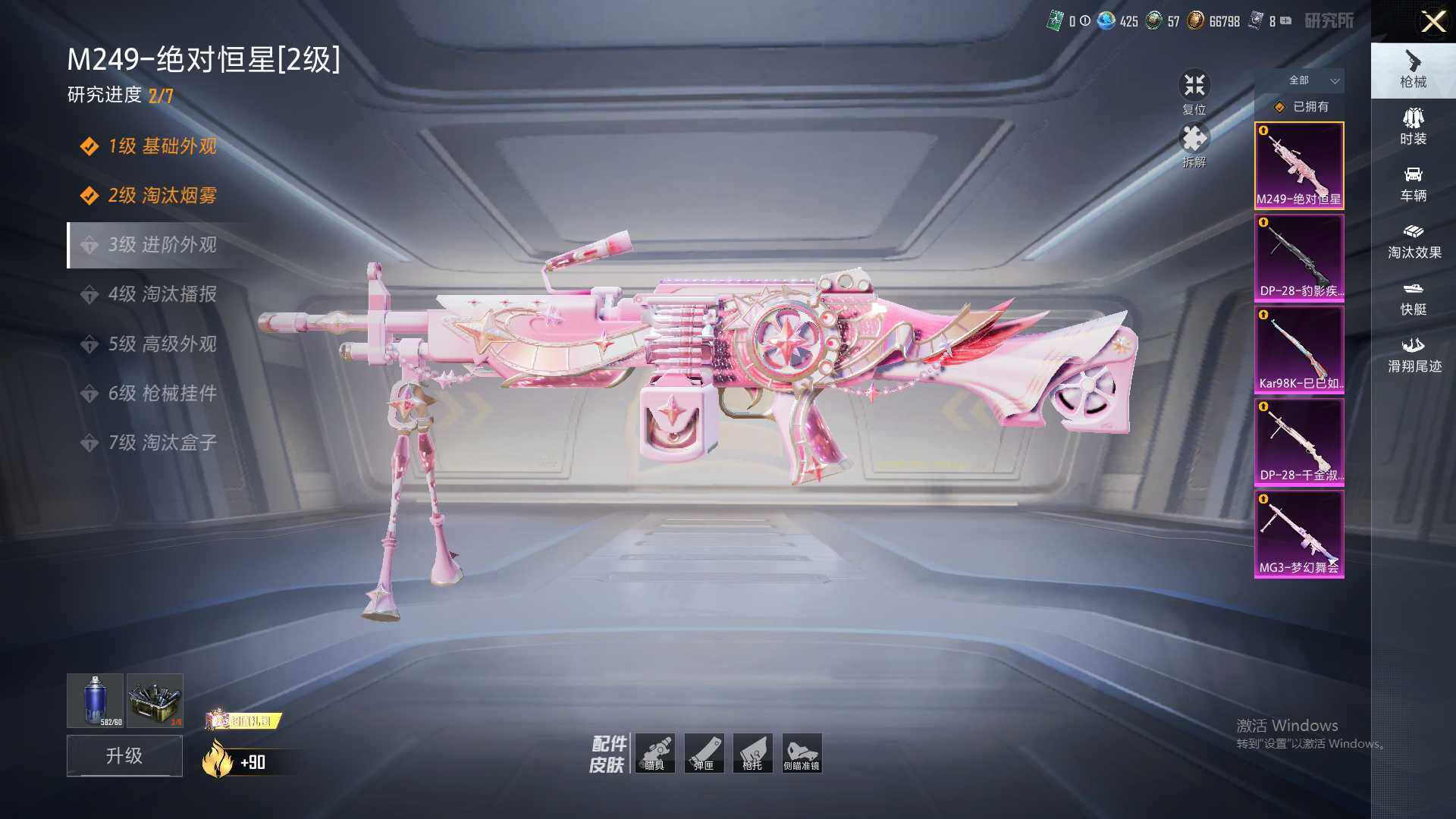 【粉色枪皮等级】:Kar98K-巳巳如意(五级),M249-绝对恒星(二级),DP-28-千金淑猫(五级),DP-28-豹影疾电(五级),MG3-梦幻舞会(七级)