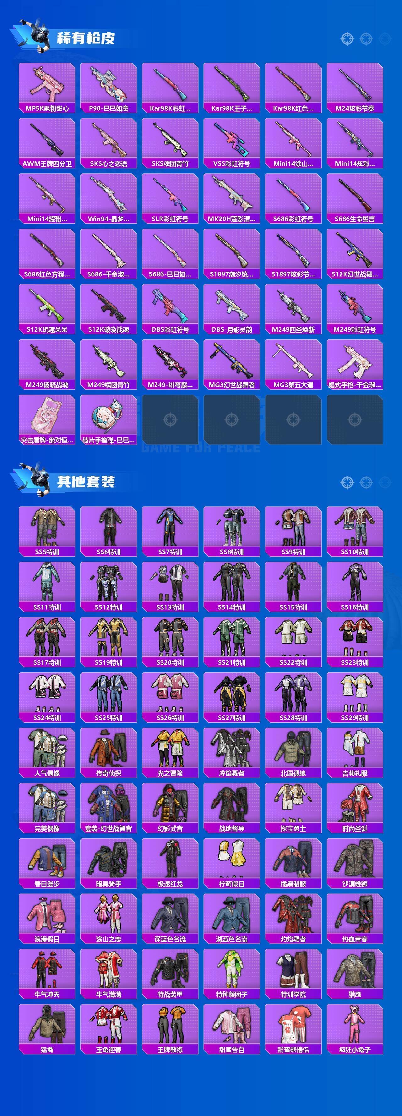 【稀有枪皮】:AUG-冰晶雪宝,AKM-夜灯,AKM-灼热熔岩,AKM-破晓战魂,AKM-萌趣颜团子,AKM-虎虎生威,AKM-龙的传人,M16A4-幻世战舞者,M16A4-红色方程式,M16A4-蓝色火焰,M16A4-千金淑猫,SCAR-L-炫彩节奏,SCAR-L-玉兔迎春,SCAR-L-红色方程式,M416-潮汐统领,M416-糯团青竹,M416-红色方程式,M416-绯红前夜,M416-蓝色火焰,GROZA-彩虹符号,AUG-天降萌叽,AUG-耀粉歌者,AUG-绝对恒星,M762-天降萌叽,M762-烈焰拳霸,M762-牛气冲天,AC-VAL-天降萌叽,蜜獾-天降萌叽,蜜獾-绯穹魔姬,UZI-啾咪啾咪,UZI-天降萌叽,UZI-炫彩节奏,UZI-红色方程式,UZI-月影灵韵,UMP45-涂山之恋,UMP45-生命誓言,UMP45-蓝色火焰,Vector-彩