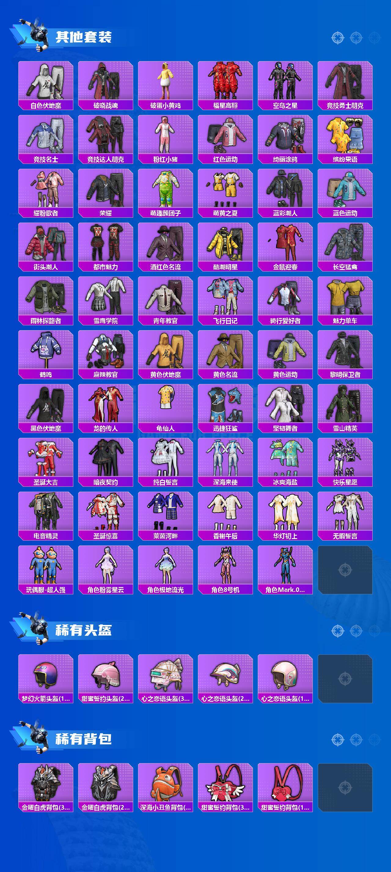 套装-龟仙人,套装-粉红小猪,角色-8号机,角色-Mark.06,套装-极速红龙,套装-破蛋小黄鸡,套装-雪山精英,套装-暗夜契约,套装-纯白誓言,套装-冰爽海盐