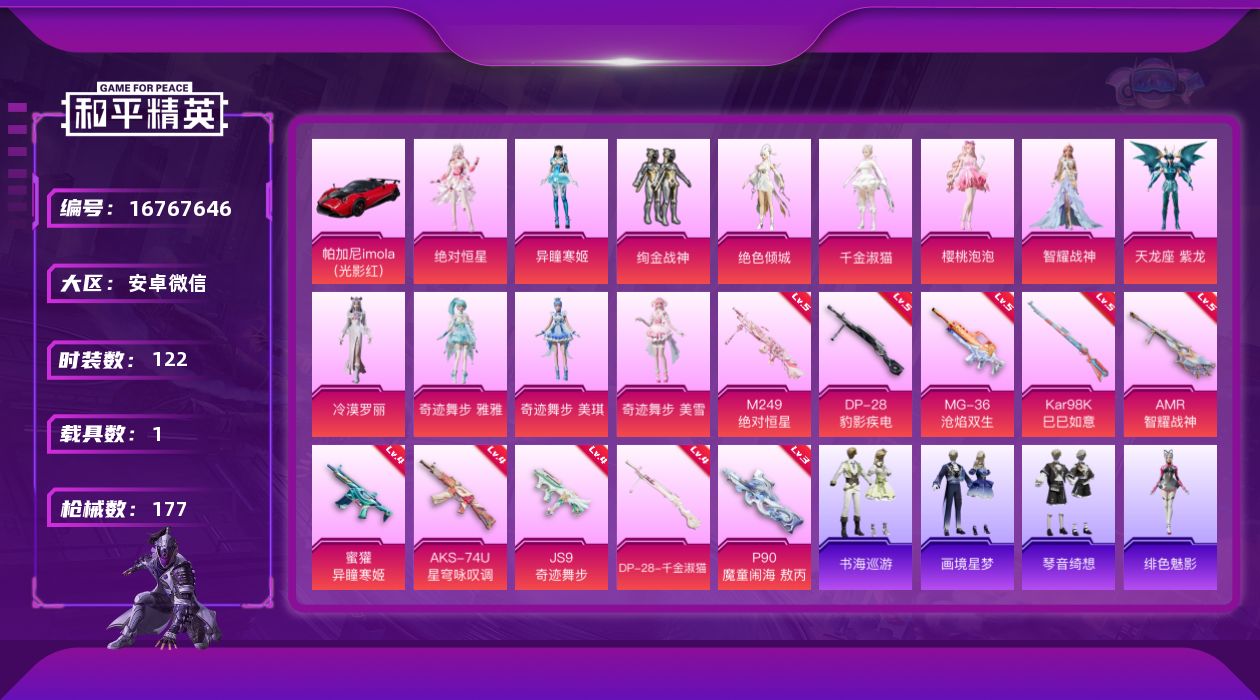 [16767646]【特价出售/店主推荐】安卓 微信-12粉装-11特效枪-1载具-6粉色飞行器-57379热力值-6王牌印记-122套装-177枪皮 【热门品类】:套装-SS1特训 【粉色套装】:角色-绝对恒星,粉装-绚金战神,角色-绝色倾城,角色-千金淑猫,角色-樱桃泡泡,角色-智耀战神,角色-天龙座 紫龙,角色-冷漠罗丽,角色-奇迹舞步 雅雅,角色-奇迹舞步 美琪,角色-奇迹舞步 美雪,角色-异瞳寒姬 【粉色枪皮等级】:蜜獾-异瞳寒姬(四级),AKS-74U-星穹咏叹调(四级),JS9-奇迹舞步(四级),P90-魔童闹海 敖丙(三级),Kar98K-巳巳如意(五级),AMR-智耀战神(五级),M249-绝对恒星(五级),DP-28-千金淑猫(四级),DP-28-豹影疾电(五级),MG-36-沧焰双生(五级) 【粉色载具】:帕加尼imola(光影红) 【粉色枪皮】:AUG-罪夜之冕,蜜獾-异瞳寒姬,AKS-74U-星穹咏叹调,JS9-奇迹舞步,P90-魔童闹海 敖丙,Kar98K-巳巳如意,AMR-智耀战神,M249-绝对恒星,DP-28-千金淑猫,DP-28-豹影疾电,MG-36-沧焰双生 【粉色飞行器】:绝对恒星飞行器,炫彩糖果飞行器,风花雪月飞行器,繁龙极客飞行器,雀灵庇佑飞行器,暮色之舞飞行器 【粉色降落伞】:绝对恒星降落伞,萌物绒绒降落伞,镜光幻境降落伞,绝色倾城降落伞,江南烟雨降落伞,精灵梦叶罗丽降落伞,千金淑猫降落伞,晶梦幻蝶降落伞,樱桃泡泡降落伞,智耀战神降落伞,圣斗士星矢降落伞,星穹咏叹调降落伞,幻彩电音降落伞,时光之吻降落伞,灵猫魔法师降落伞,奇迹舞步降落伞,异瞳寒姬降落伞,炫彩糖果降落伞,暮色玫影降落伞 【稀有套装】:套装-圣穹绘梦,角色-超感刻度,角色-甜心蒙太奇,套装-雪国风尚,套装-炫彩糖果,角色-摩登魅猫,套装-燕燕于飞,套装-鱼渊荷华,套装-粉恋花,套装-紫幽梦,套装-蓝冰羽,角色-猎影月神,套装-星影赞美诗,套装-星渊小夜曲,角色-时希公主,套装-朱霞炽焰,套装-凌霄紫焰,套装-擎苍青焰,角色-绯色魅影,角色-紫俏灵猫,套装-书海巡游,套装-画境星梦,套装-琴音绮想,角色-霜刃之御,角色-月烬之祷 【稀有枪皮】:S12K-镜光械姬,MK12-镜光械姬,AUG-冰晶雪宝,SCAR-L-镜光械姬,AKM-极光猎影,SCAR-L-炫彩节奏,M416-夜