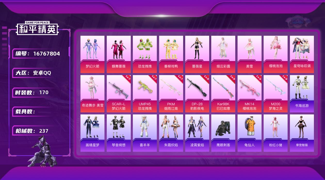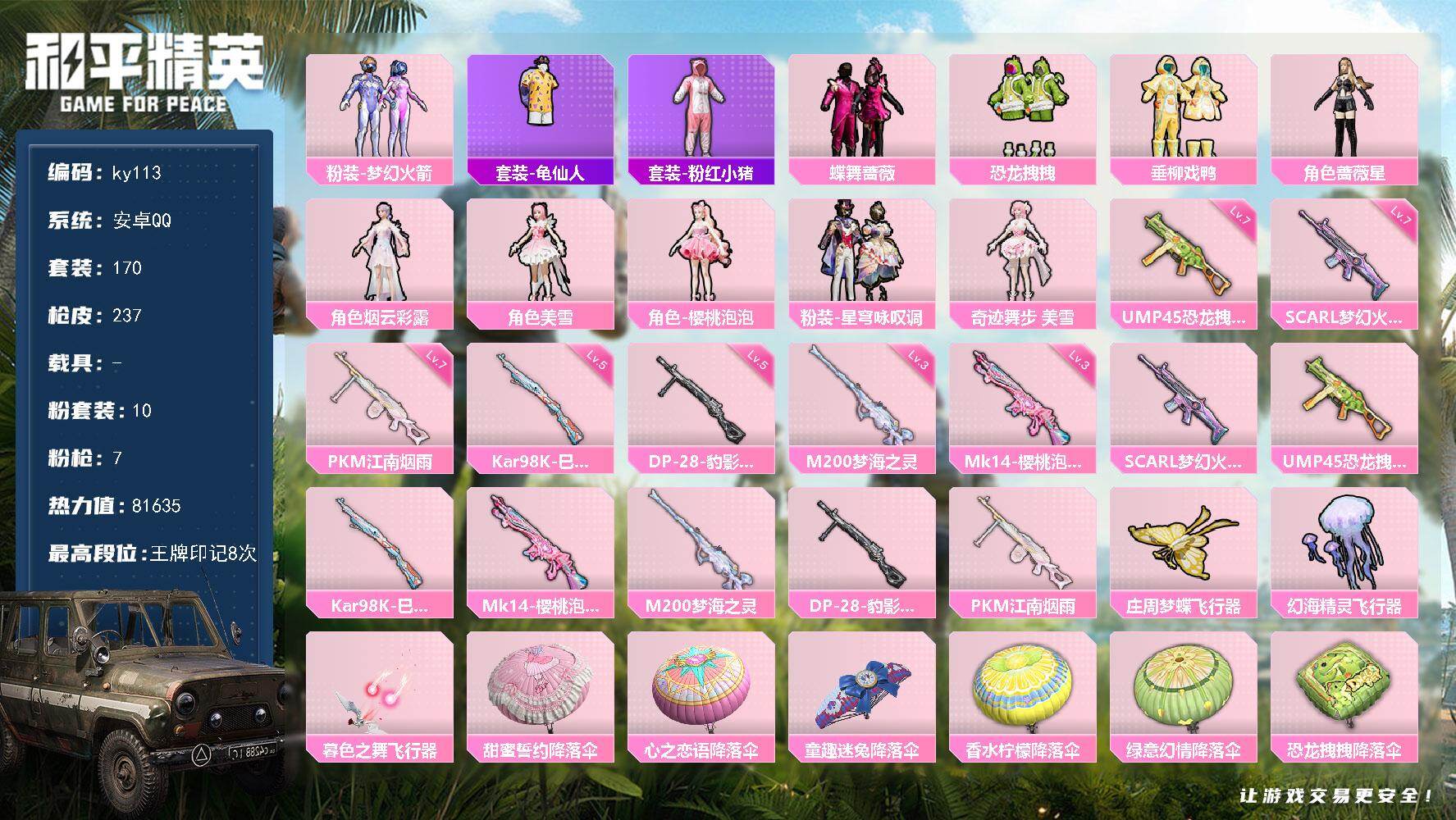[16767804]安卓 手Q-10粉装-7特效枪-0载具-4粉色飞行器-81635热力值-8王牌印记-170套装-237枪皮